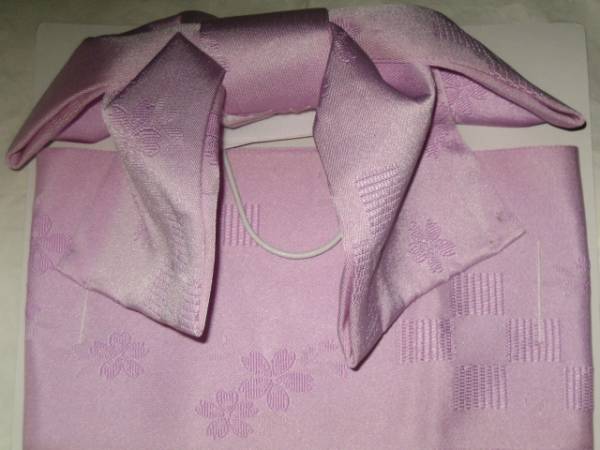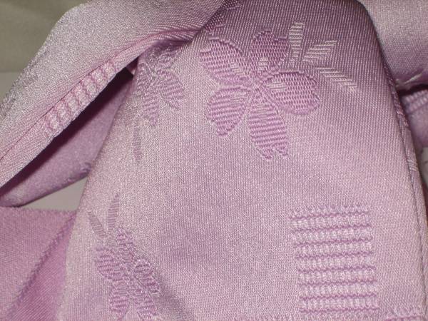 女性yukata用、地紋柄結び帯 薄紫ピンク? ポリエステル 新品(織り地紋柄ありです。波状の写りはレンズの光学的ないたずらで現品にはありません、また薄く濃く写っている場合もあります)、胴部--帯巾約17,0cmx長さ約130cm、リボン部は横に約30cm。見た範囲で汚れないと思いますが、着用に差し支えない薄汚れ(多分ない?)はあってものお値段で出品です。