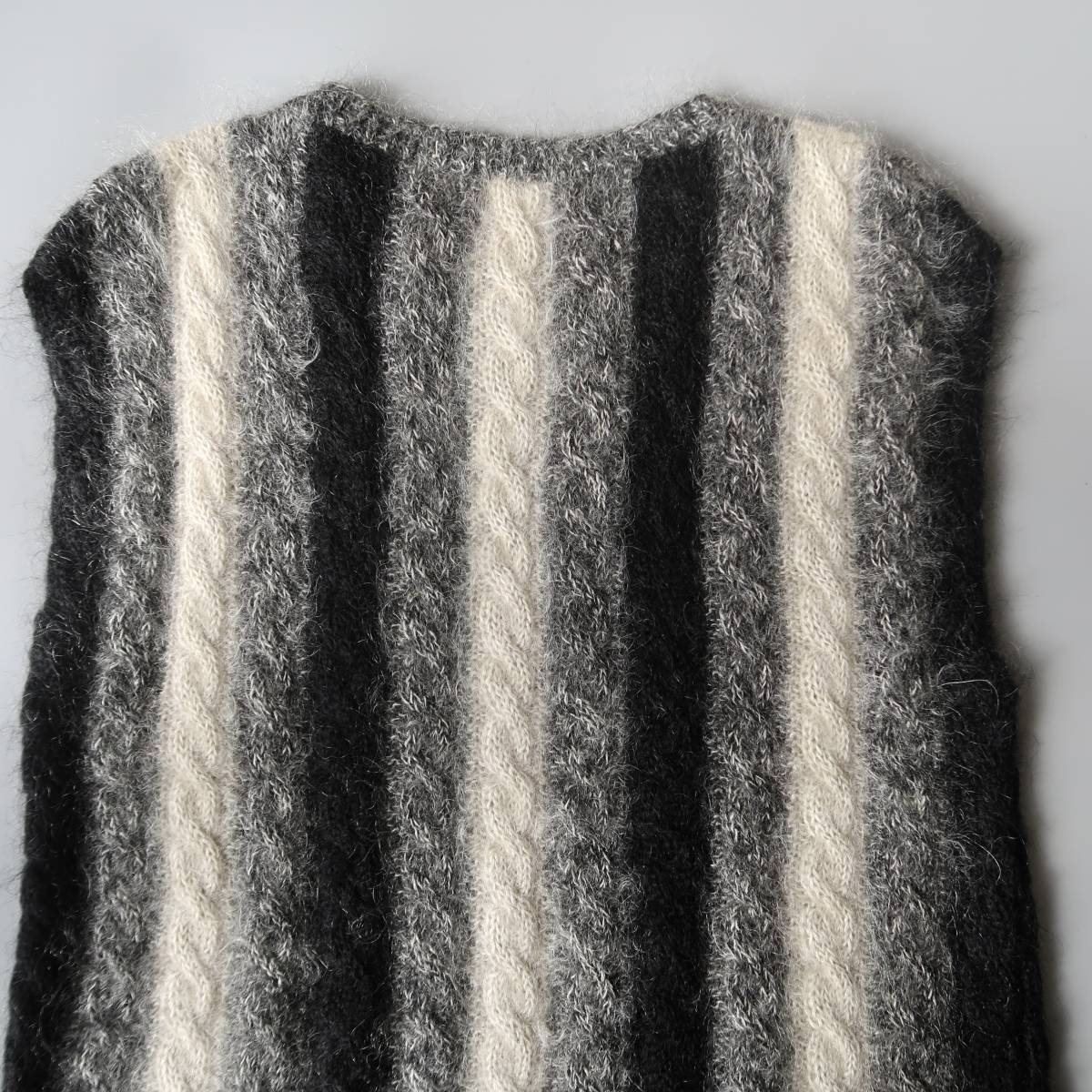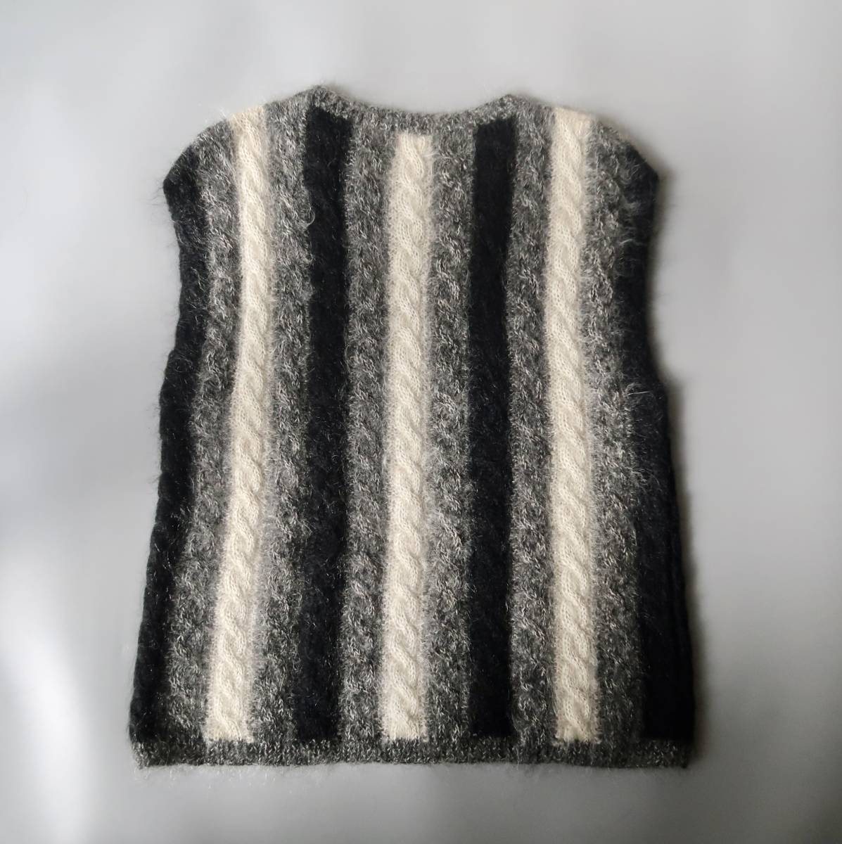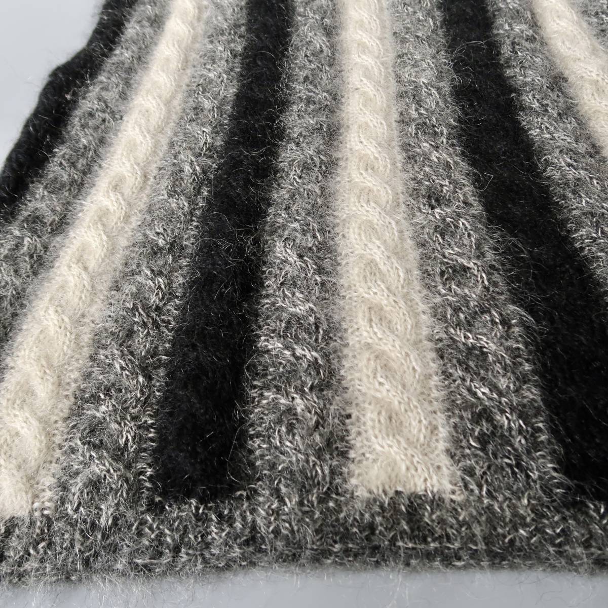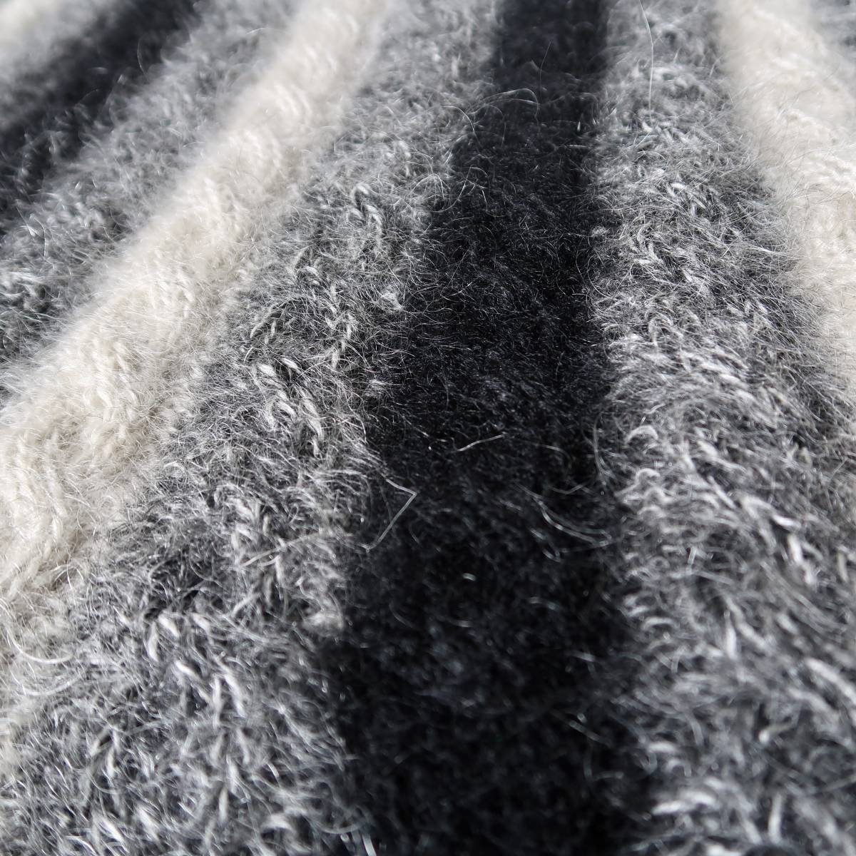 ブラック、グレー、ややクリームがかったホワイトのモノトーンカラーをモヘア多めの素材で編んだ、性別を問わず着れる1点もの。