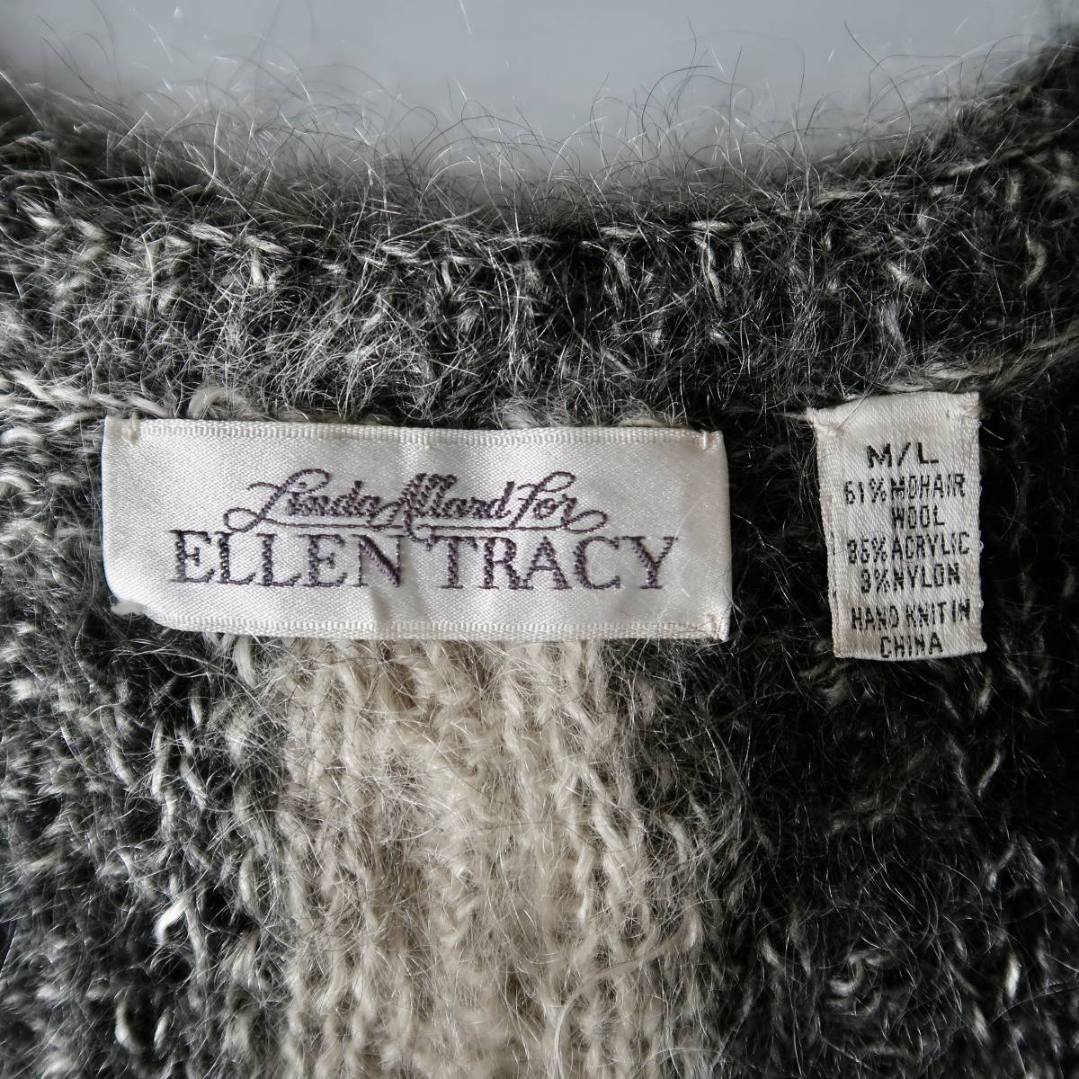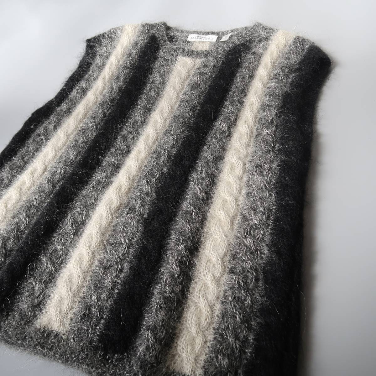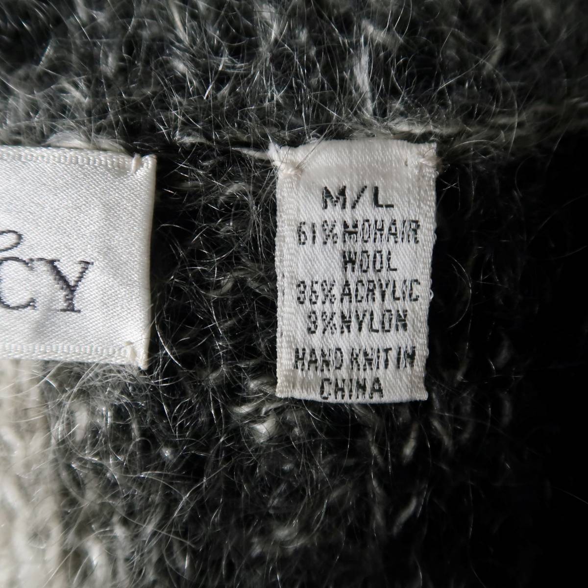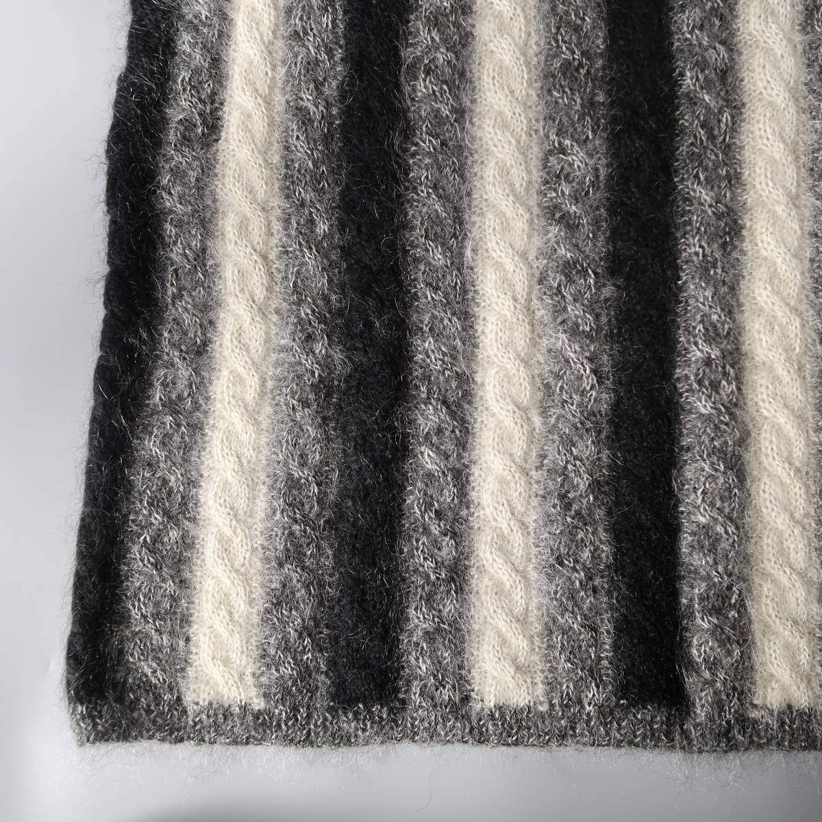 ブラック、グレー、ややクリームがかったホワイトのモノトーンカラーをモヘア多めの素材で編んだ、性別を問わず着れる1点もの。