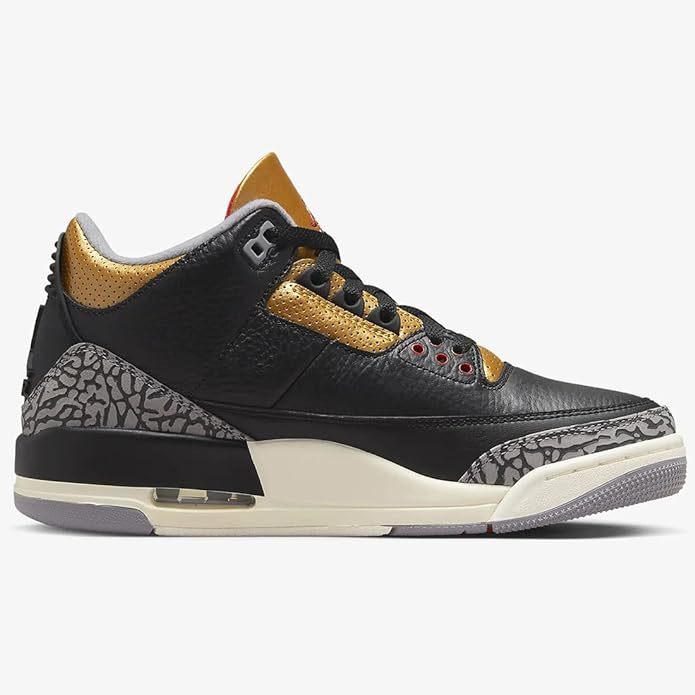 その時のオリジナルカラーである、通称"BLACK CEMENT(ブラック セメント)"、そこにメタリックゴールドを差し込み、ウィメンズモデルらしくドレスアップした新色がスタンバイ。ヒールとトゥに配置されたエレファントパターンが特徴的なアッパーは、シュリンクレザーとパンチングレザーを組み合わせて構築。重厚感あるブラックのボディ、そしてメタリックゴールドのコンビネーションでラグジュアリーな雰囲気に。シューレースホールやタンの"ジャンプマンロゴ"にはアクセントとしてレッドをセット。セイルカラーのミッドソールが、重厚感を程よく和らげ、シーズンレスで履ける1足となった。商品箱の凹みや破れ等がある場合がございます。ご了承下さい。