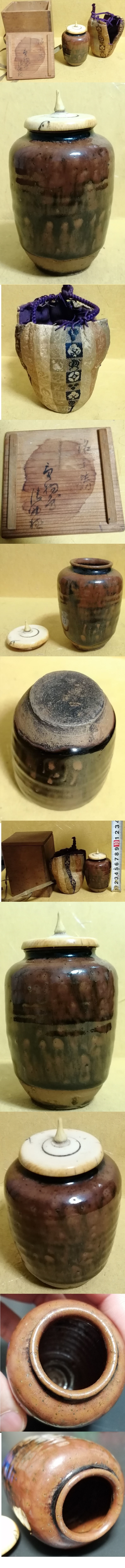 宋代 唐物 肩衝 茶入 古裂 仕覆 薄胎醤釉器 在銘 中国 唐物 茶器 茶道具 箱
