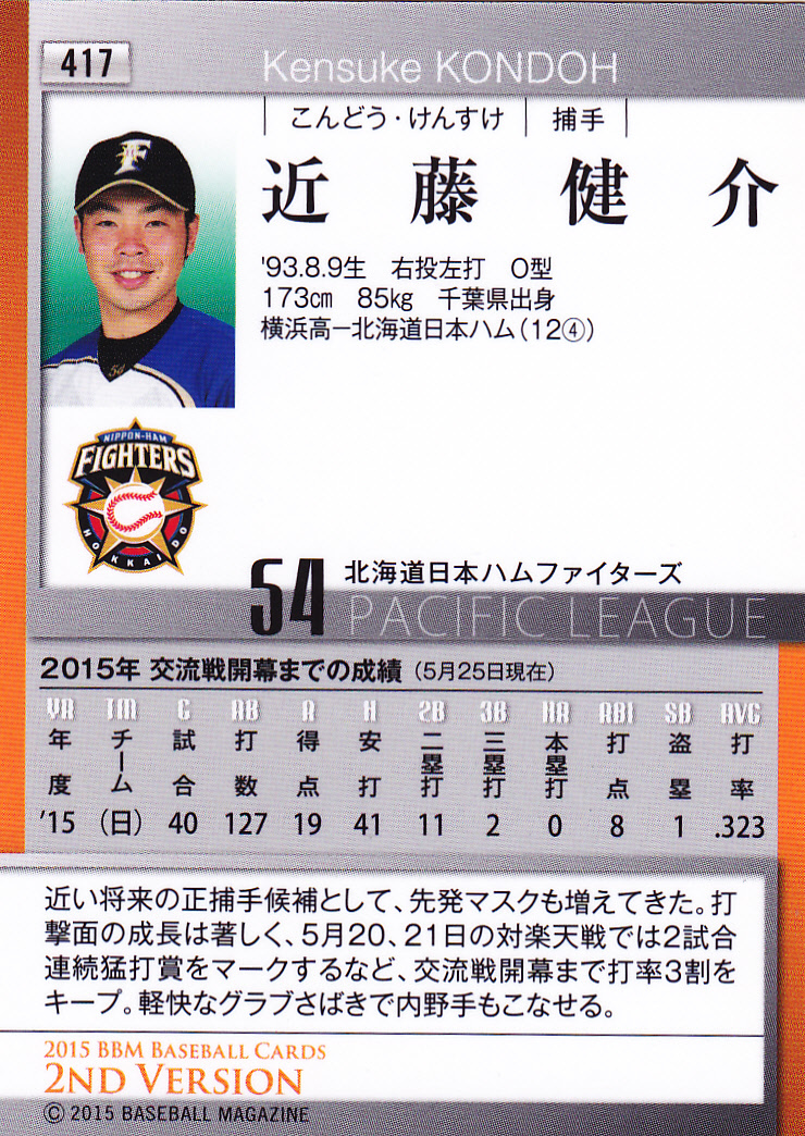 BBM2015ベースボールカード2nd 417 近藤健介 千葉県 横浜高校 北海道日本ハムファイターズ