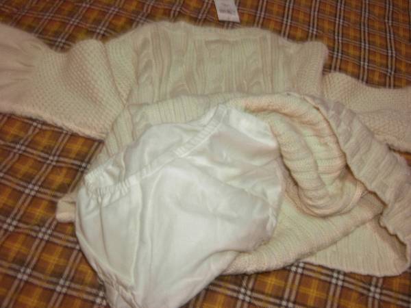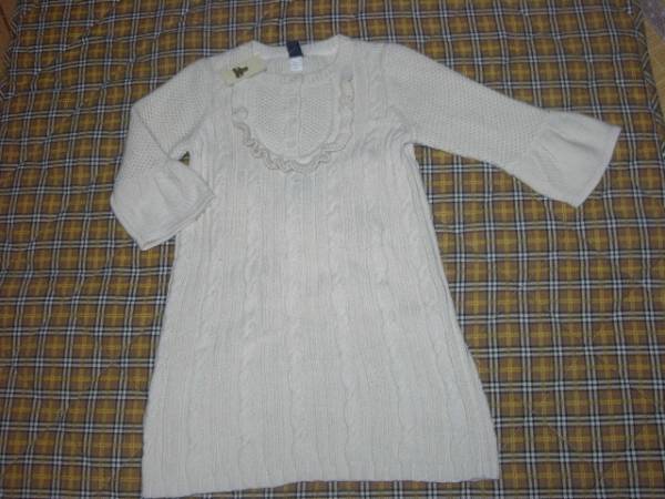 綿60、アクリル40%の案外太目の糸であまれた生成りのケーブルニットワンピースです。着丈58、身幅32、袖33、肩幅25cmくらいです。画像3で写してありますがカバーパンツ(綿100%)もついています。今は縫い付けてあるだけですのでもちろん取り外せます。定形外可。