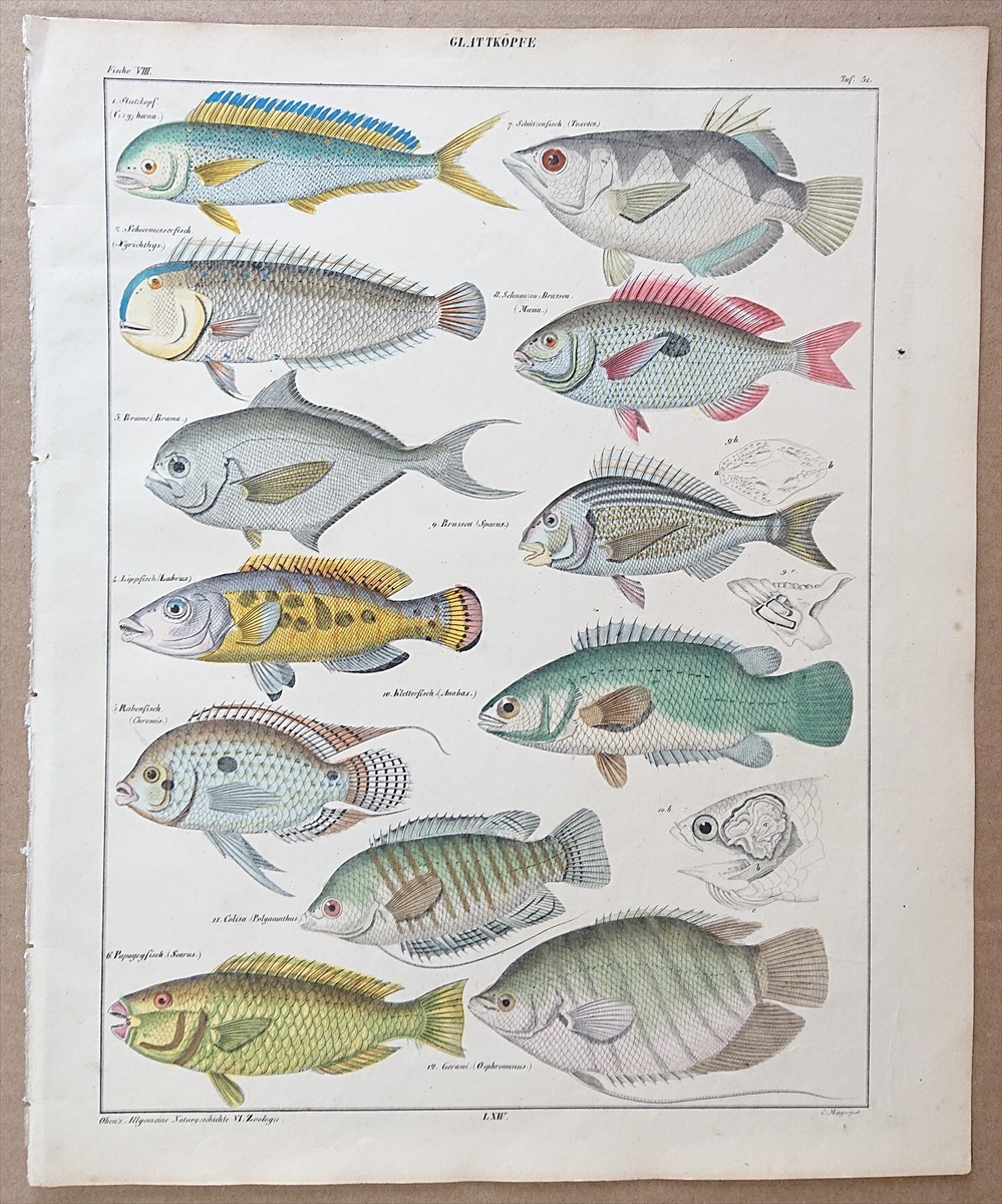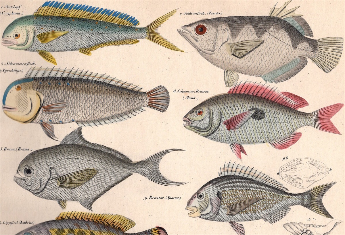 1843年 Oken 博物図鑑 手彩色 鋼版画 大判 シイラ ヒラベラ ニシシマガツオ シジュウカラ テッポウウオ キノボリウオ 博物画 熱帯魚