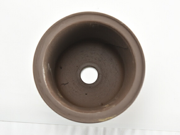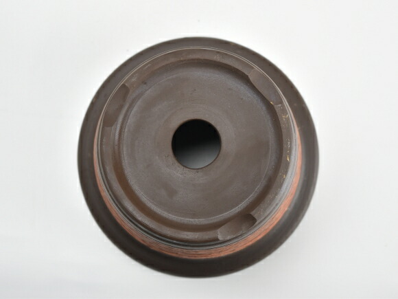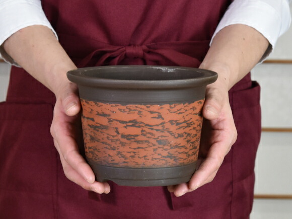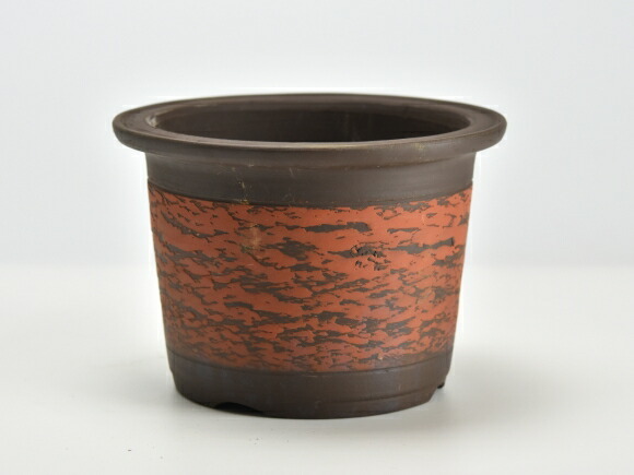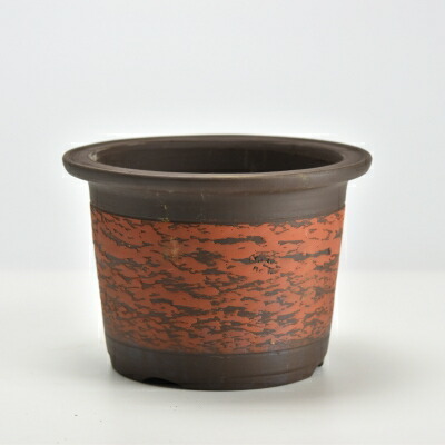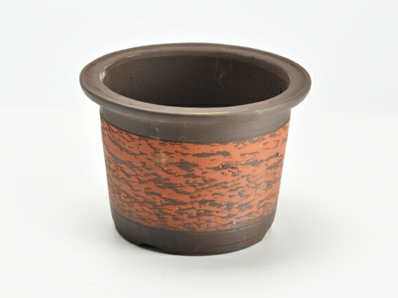 素朴な風合いの盆栽鉢です。信楽焼の朱焼陶器で、松の皮を模倣したような技法で知られる松皮(まつかわ)づくりです。赤みを押さえた朱色が落ち着いた印象です。当店では藤を植え込んで販売しています。背の高い花物盆栽にいかがでしょうか。