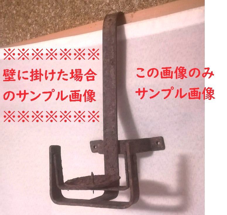 《商品説明》 9枚目の最後の画像は壁に掛けた時のサンプル画像になりますが、 壁に掛ける事もできる鉄製の燭台になります。 2枚目、6枚目の赤矢印の所ですが、ローソクを立てる受皿が反って歪んでいます。 全体的に錆びなどあり、触れると鉄粉が落ちます。 受皿の部分は 支柱の部分を持って可動しますが、錆びていて きついです。 全体的に錆びていますが、受皿の部分はグラグラという訳でなくて普通に固定されている感じです。 尚、可動される時は受皿部分は触らずに、支柱の部分を持って可動された方が良いと思います。 テーブルに置いた1枚目の画像の状態で 25.5cm×10.7cm 高さ11.8cm | |