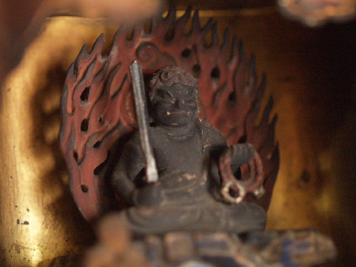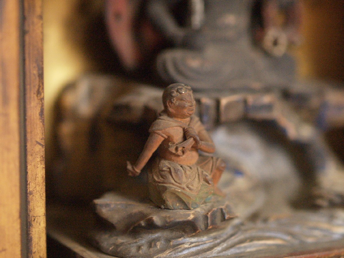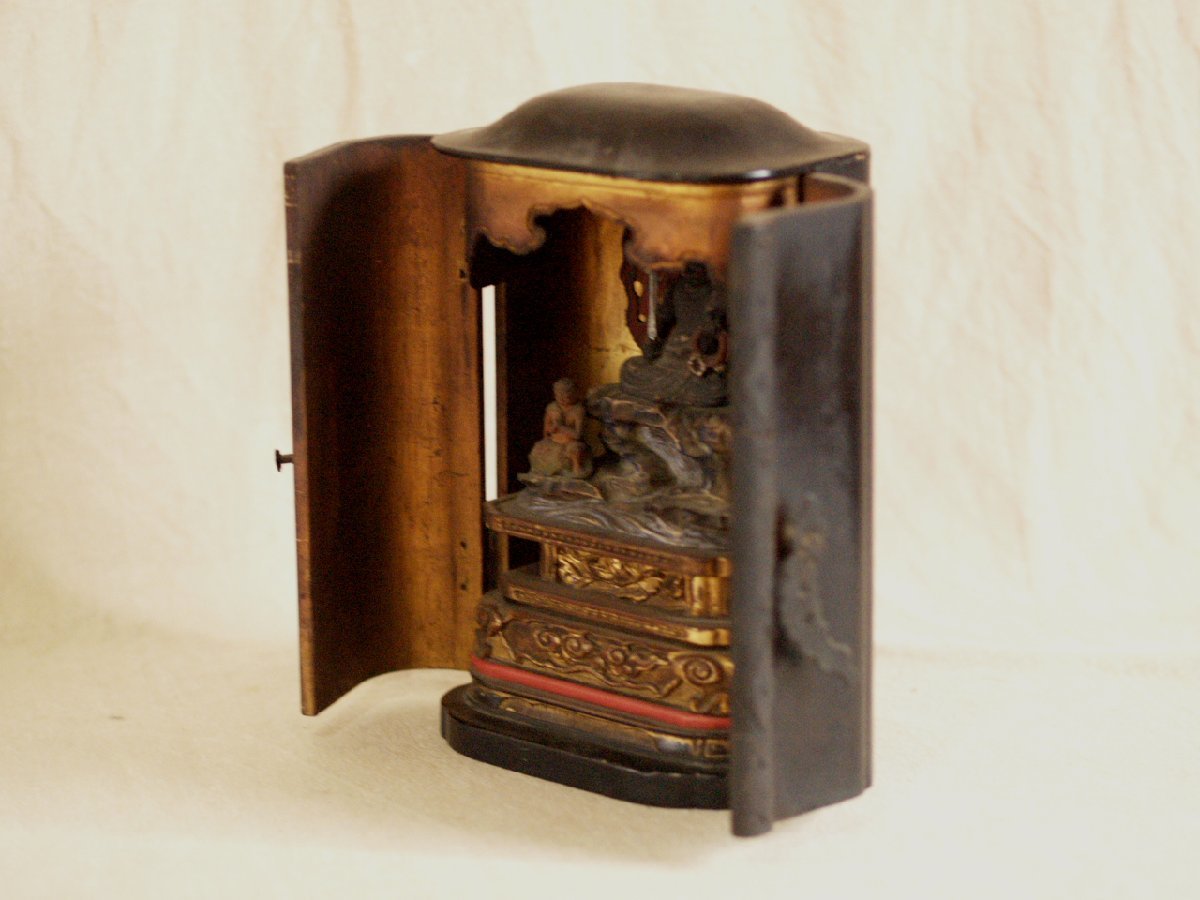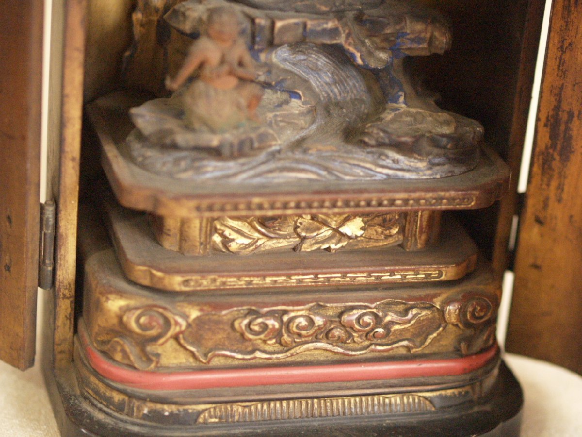 大変貴重な桃山時代頃-江戸前期 16-17世紀頃 漆金具厨子不動明王木彫仏像です。 武田信玄にも信仰が大変深かった仏像様で すべての悪魔や敵を撃滅し、 行者を守護するとともにその菩薩を成就させます。 珍しく専用に仕立てられた 厨子と一体化した品で 時代の特色を表し 不動明王の憤怒の表情 童子の彫が大変細密で ありながら躍動感あふれ 並々ならぬ力量の持ち主の作という事が 伝わってきます。 厨子が21センチ程度の 愛玩サイズで、仏壇は勿論、 何処にでも飾りやすいお品です。 黒漆塗りの落ち着いた 外装とは一変、内部は 豪華な金張りが施された 厨子と合わさって 小さいながら表情も逞しく 覇気が感じられるお品です。 長年お寺やお仏堂で飾られていた金箔の焼けや 経年の汚れなどの時代感があり、 それによる厳かさがあります。 片側にもう一人側近の童子が いたと思われますが現状ありません。 その他総じて良好です。 古い品ですので 画像もご確認の上ご検討ください。 ★サイズ(約寸) 厨子 高さ21cm 幅12.5cm 奥行9.5cm 重量560gほど 飾って福を呼び込んでください♪ |
