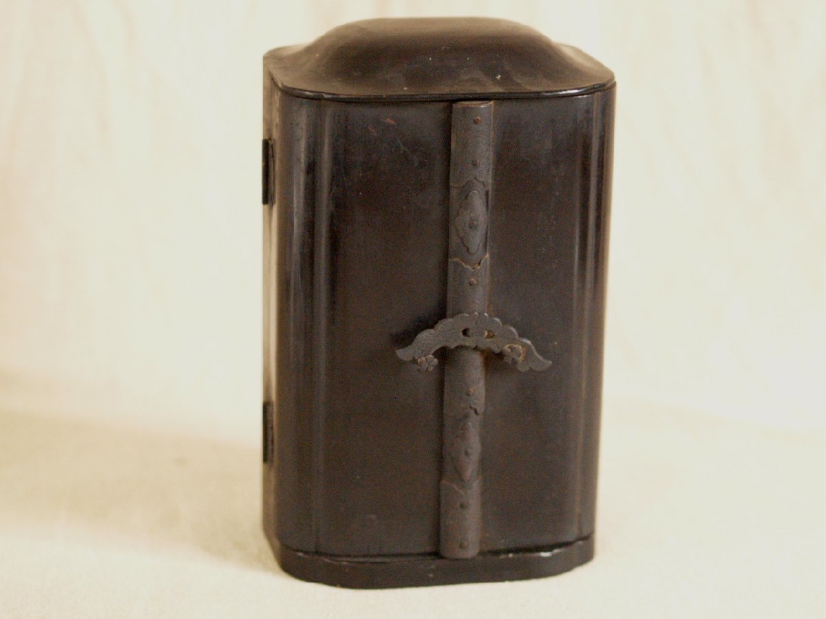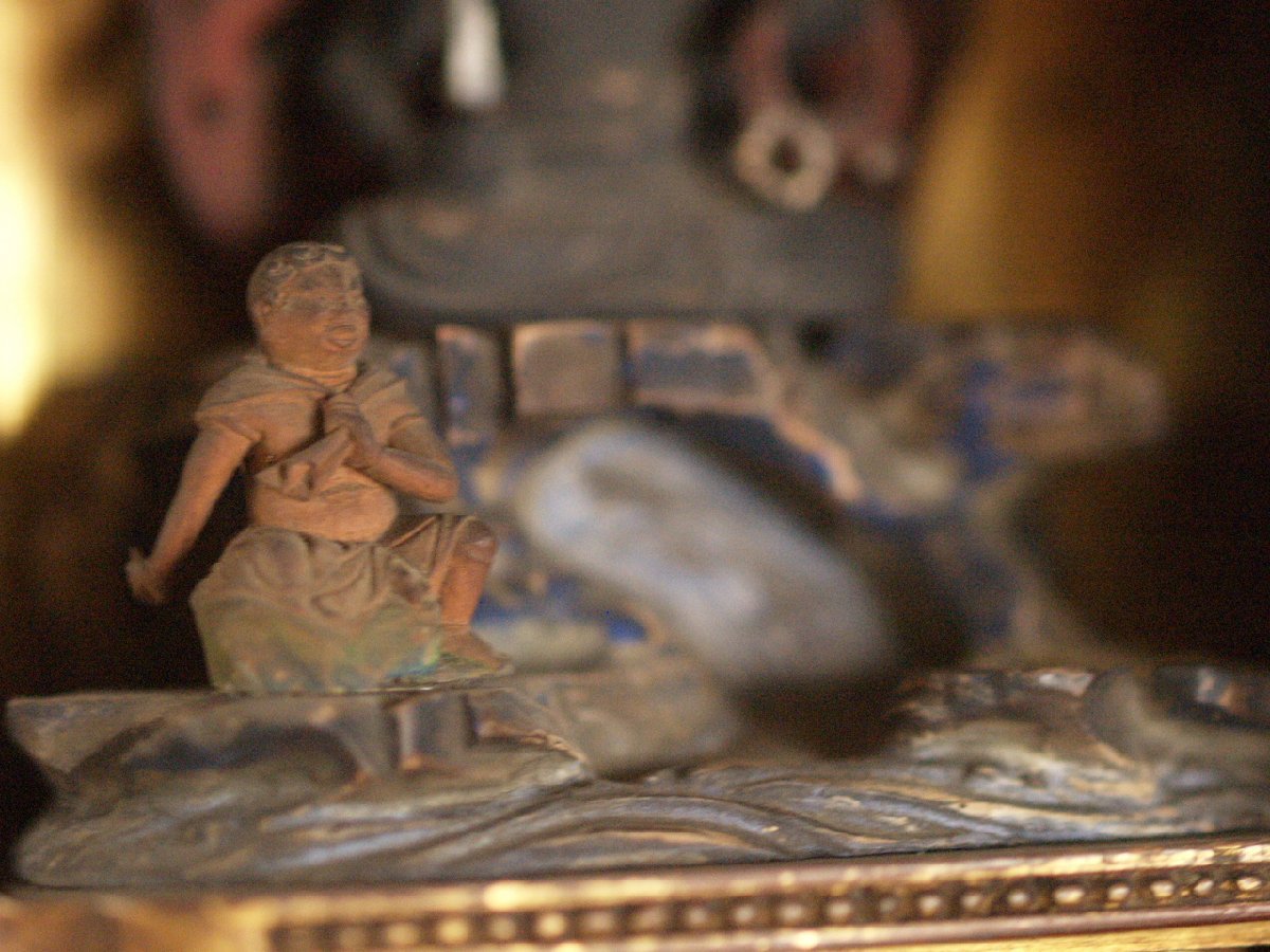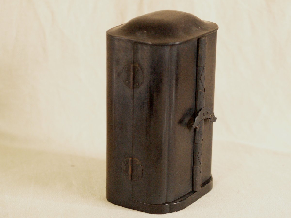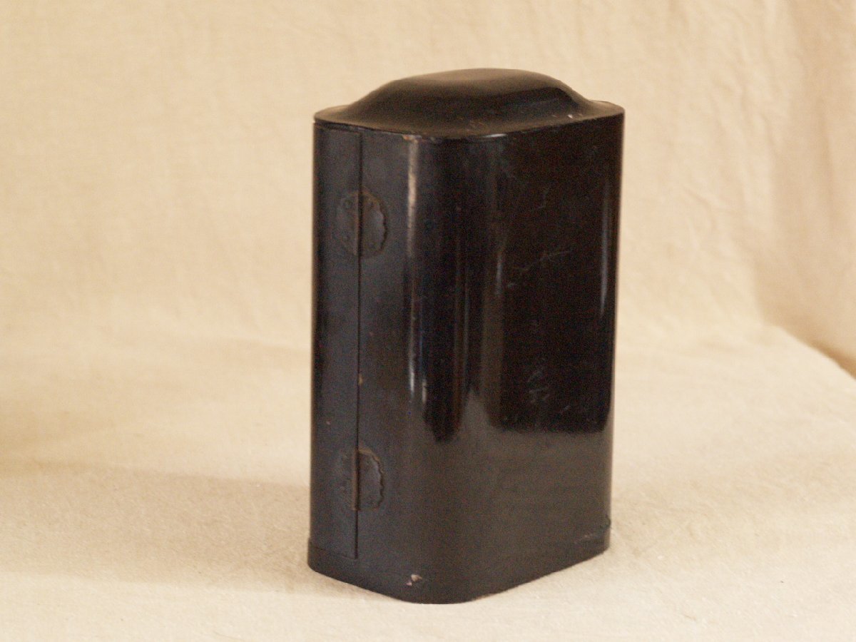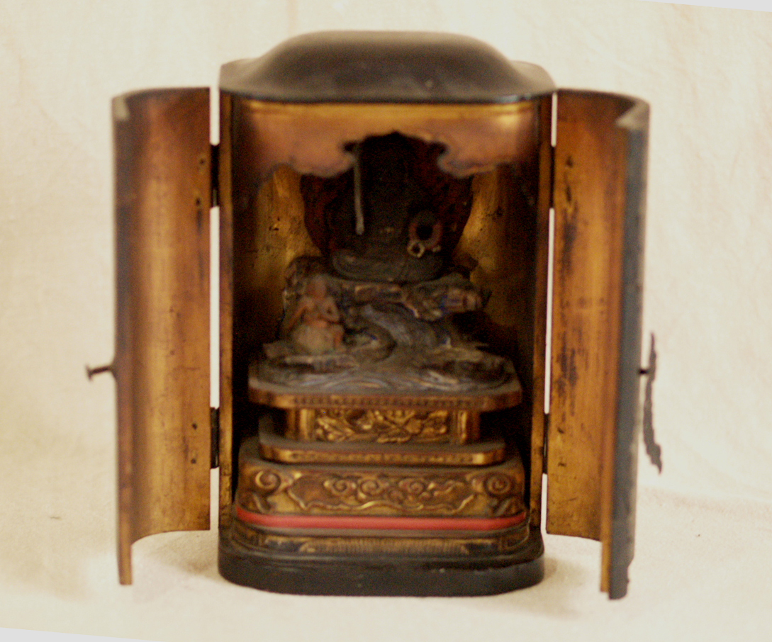 大変貴重な桃山時代頃-江戸前期 16-17世紀頃 漆金具厨子不動明王木彫仏像です。 武田信玄にも信仰が大変深かった仏像様で すべての悪魔や敵を撃滅し、 行者を守護するとともにその菩薩を成就させます。 珍しく専用に仕立てられた 厨子と一体化した品で 時代の特色を表し 不動明王の憤怒の表情 童子の彫が大変細密で ありながら躍動感あふれ 並々ならぬ力量の持ち主の作という事が 伝わってきます。 厨子が21センチ程度の 愛玩サイズで、仏壇は勿論、 何処にでも飾りやすいお品です。 黒漆塗りの落ち着いた 外装とは一変、内部は 豪華な金張りが施された 厨子と合わさって 小さいながら表情も逞しく 覇気が感じられるお品です。 長年お寺やお仏堂で飾られていた金箔の焼けや 経年の汚れなどの時代感があり、 それによる厳かさがあります。 片側にもう一人側近の童子が いたと思われますが現状ありません。 その他総じて良好です。 古い品ですので 画像もご確認の上ご検討ください。 ★サイズ(約寸) 厨子 高さ21cm 幅12.5cm 奥行9.5cm 重量560gほど 飾って福を呼び込んでください♪ |