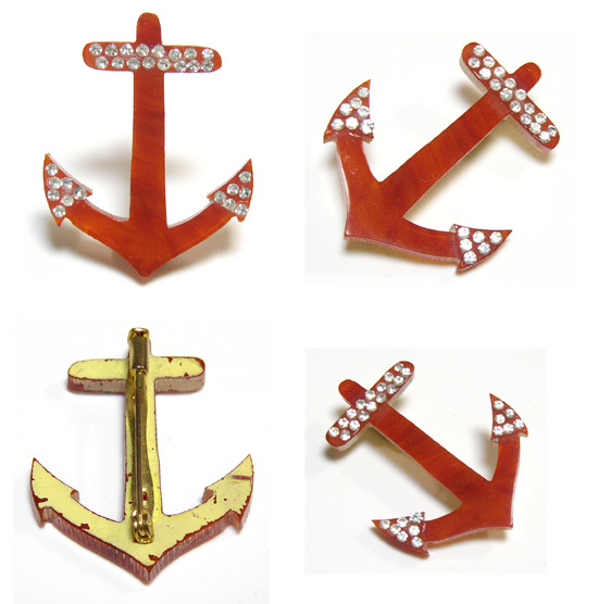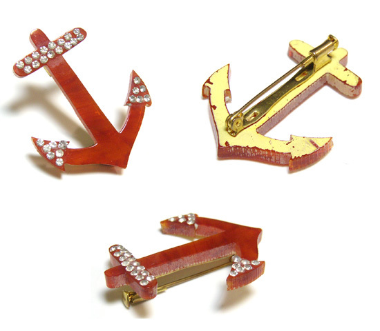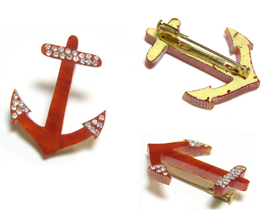 ヴィンテージ アンカー ブローチです。状態は、古い物ですので、擦れや裏側に経年による色のはげがありますが、ビンテージの雰囲気ある物です。アメリカで購入しました。デザインや色合いがとても可愛いです。古い物ですので、状態はそれなりですが、年代物の風格とレトロ感ある物です。縦4.2cm、横3.3cmです。ビンテージ物とご理解頂いて、ノークレーム、ノーリターンでお願いします。