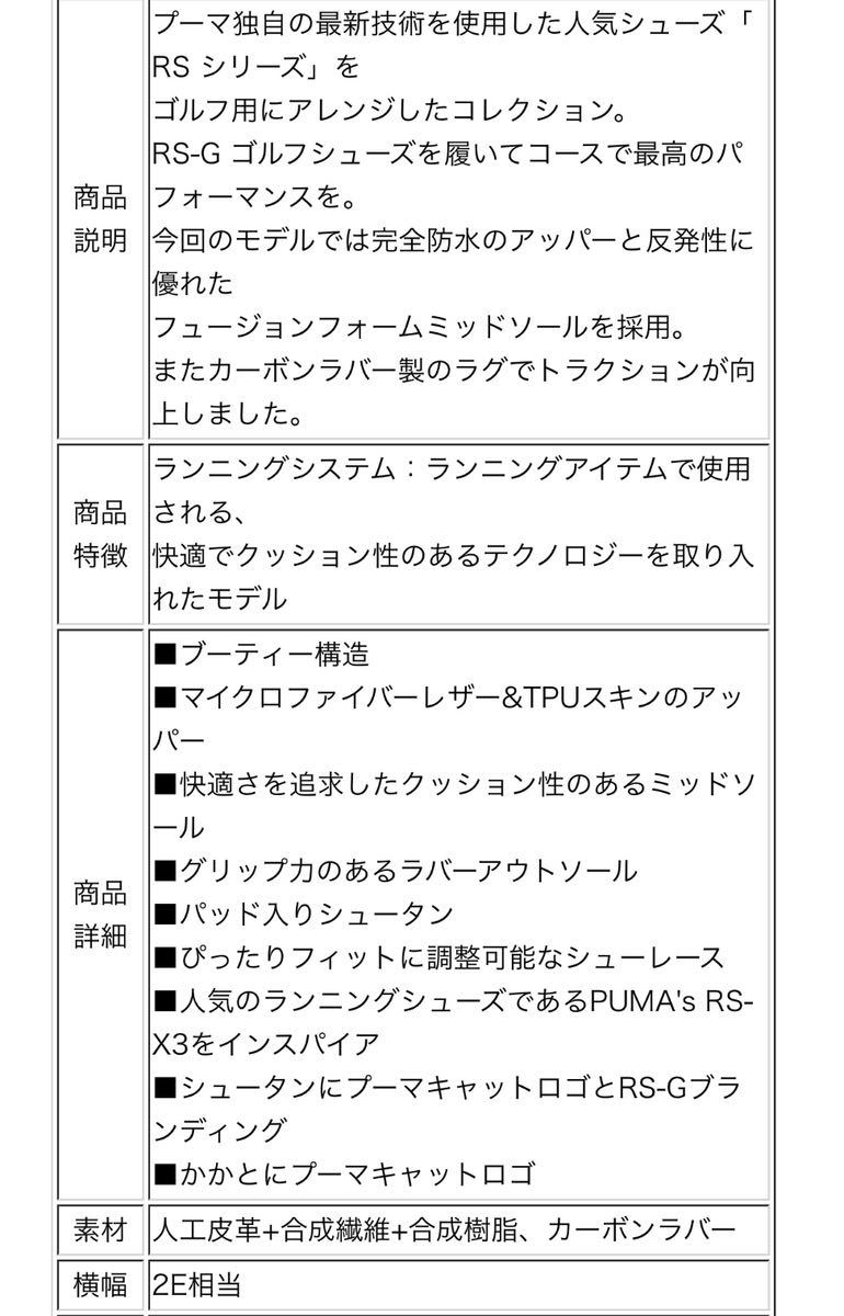 RS-Gコレクションプーマ独自の最新技術を使用した人気シューズ”RS シリーズ”をゴルフ用にアレンジしたコレクションの登場です。防水で、ゴルフに最適なグリップ力を持つスパイクレスシューズ。ソフトEVAフォームと高反応ラバーの組み合わせが反発エネルギーとクッション性を同時に実現し、長時間に渡って快適性を維持するフュージョンフォームを採用。マイクロファイバーを使用した人工皮革が軽量性と耐久性を提供します。ゴルフではもちろん街中でも履ける ON/OFF 着用できるモデルです。