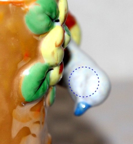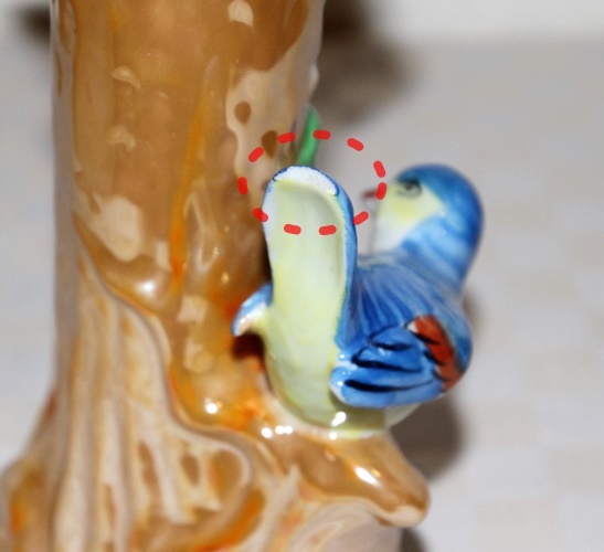 青い鳥の後ろ側、尾の先端部分にカケがありますが、正面からは目立ちません。(写真参照)
