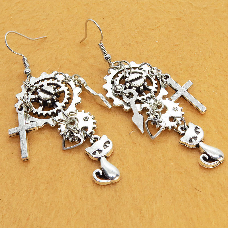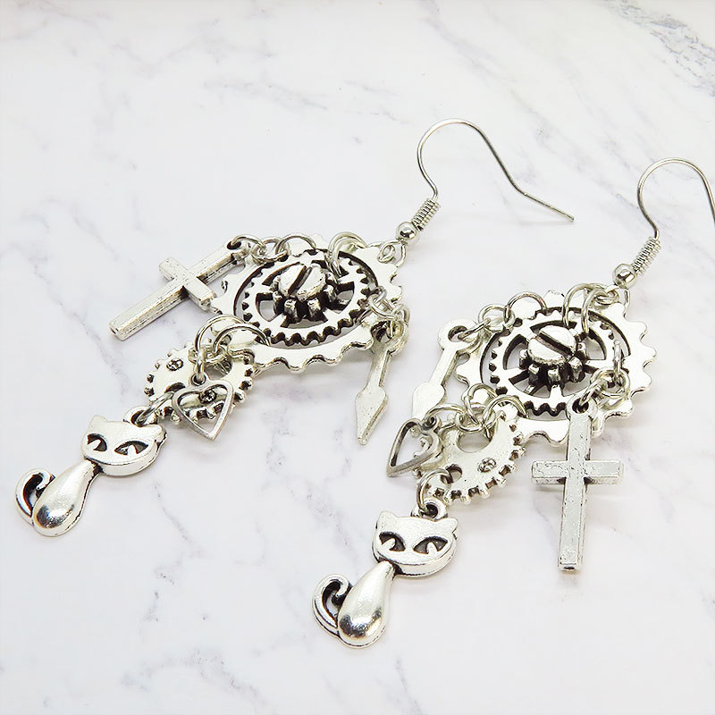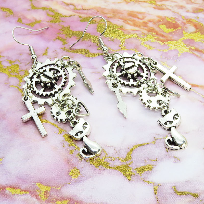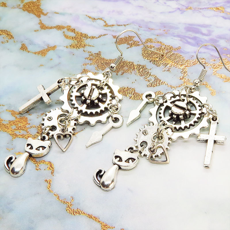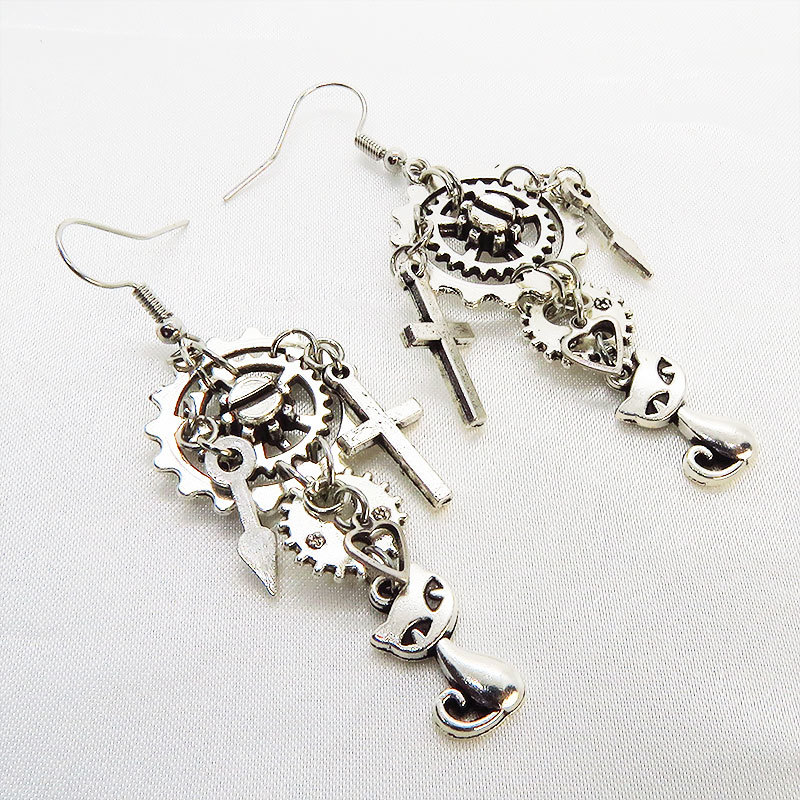 アンティークシルバー スチームパンク風 猫と歯車・ギアを組合せたピアス 時計の針 ロザリオ サージカル可
