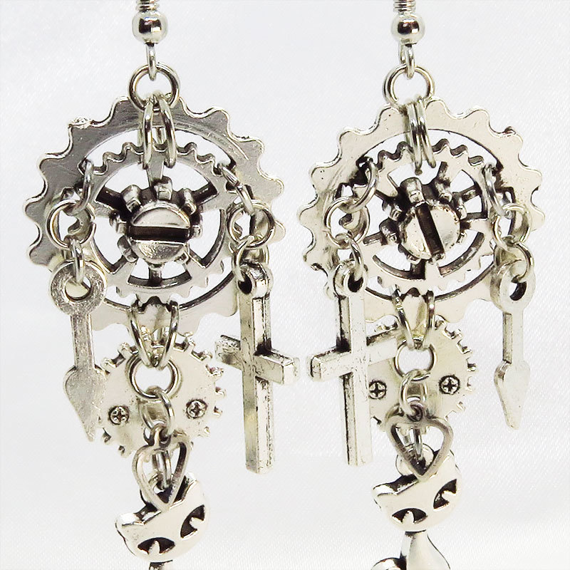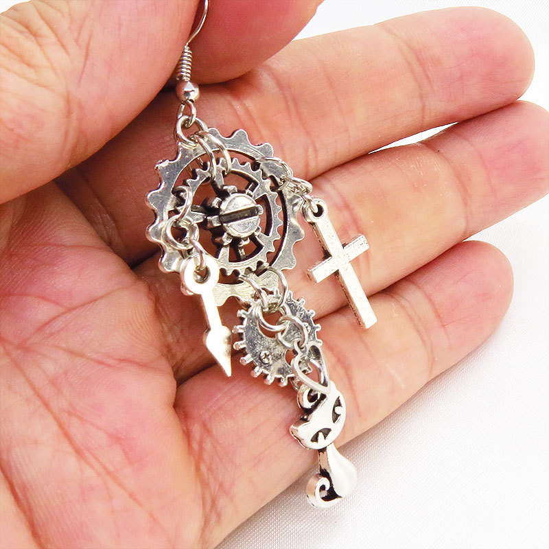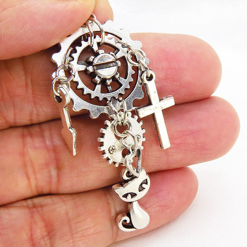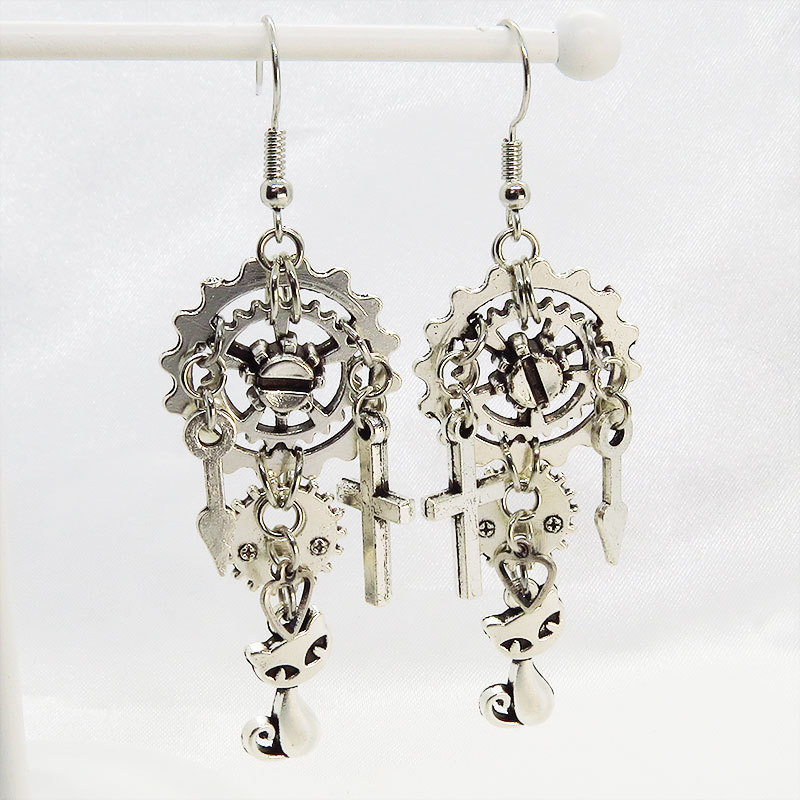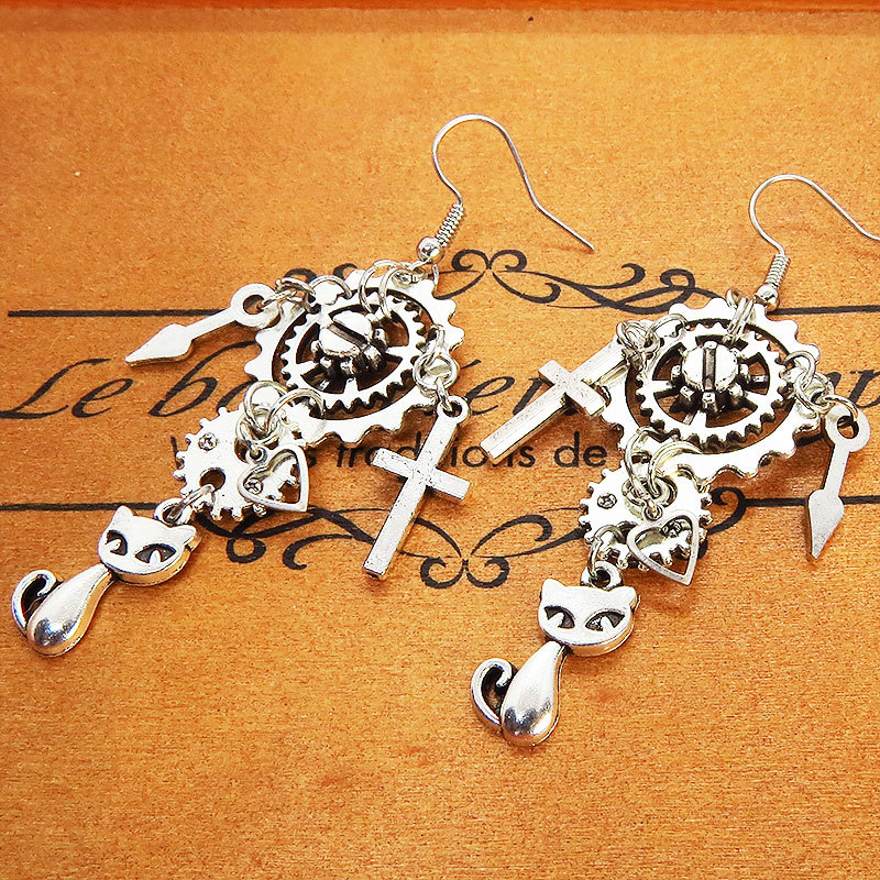 アンティークシルバー スチームパンク風 猫と歯車・ギアを組合せたピアス 時計の針 ロザリオ サージカル可