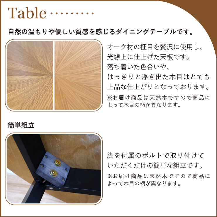 輸入品ダイニングテーブル 組立品幅1500mm×奥行き900mm×高さ720mm材質:オーク突板/MDF/ラバーウッド突板/MDF/ラバーウッド※天然木を使用しているのでお届け商品によって木目が異なります。 ダイニングチェア 完成品幅505mm×奥行き570mm×高さ760mm (座面高425mm)材質:ラバーウッド無垢/曲木合板新品の通常在庫品ですが、特別価格のため アウトレット品扱でおねがいいたしますもし細かな擦りキズ・汚れ等があった場合はご了承お願いします・表記サイズと多少異なる場合がございます・モニター環境により商品の色の見え方に誤差が生じる場合もございます・一般家庭向けの商品です送料無料※東北・北海道・沖縄・離島は別途送料がかかります※お届け先によっては配送できない場合がございます・お届けの際にはドライバーが「1人」でお伺い致します・基本的に玄関渡しとなります・土日祝の配達日指定不可もしく配達曜日が限定される地域がございます・大型品は専門の配送会社でお届けとなり15日程度いただいております・大型品の配達時間は17時までとなる場合がございます