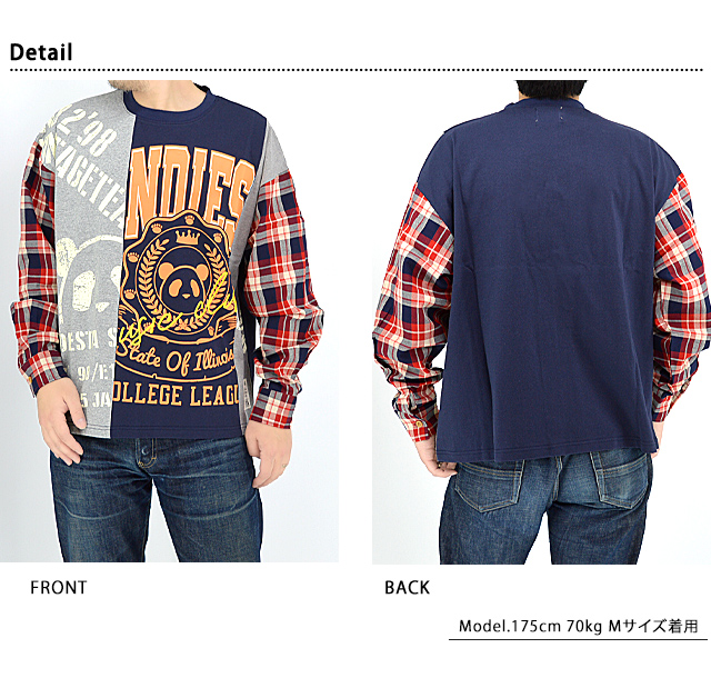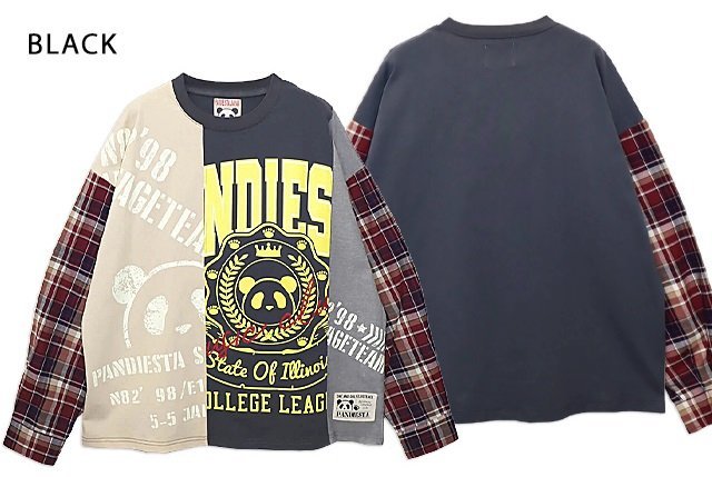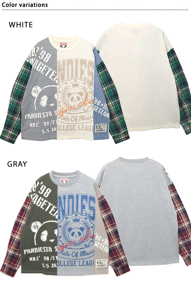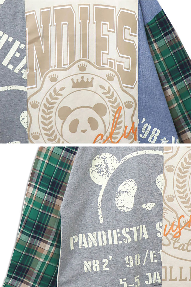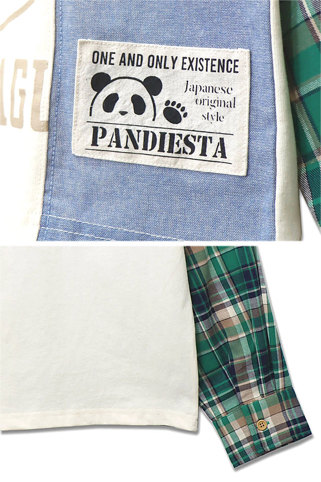和柄ブランド【錦】の姉妹ブランドとして誕生した、お茶目なパンダをモチーフとした【PANDIESTA JAPAN】より「シャツ袖リメイクロングTシャツ(513954)」のご紹介です。 通気性と吸汗性に優れた綿100%の天竺素材をベースに異素材と切り替えたリメイクTシャツが長袖バージョンとして登場しました。 フロントを大胆に切り替え、袖にはチェックの布帛生地を用いたリメイク風のパッチワークで仕上げた長袖Tシャツになります。 | ||||||||||||||||||||