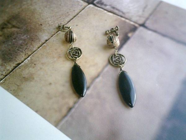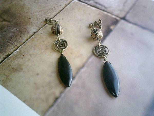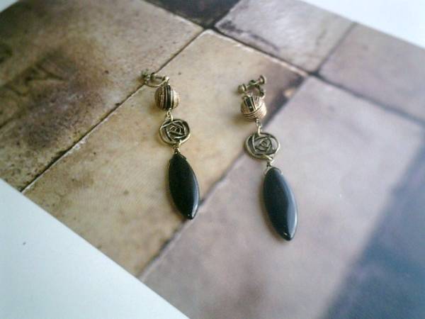 コゼットの裁縫箱・・シリーズです♪シックな黒とベージュ・・キュートなオニキスのイヤリングです♪漆黒のオニキスがアンティーク・モダンな表情です♪オニキスは32×12ミリ位のマーキスです♪薔薇の透かしチャームやアンティークビーズを合わせてキュートです♪長さは全長9センチ位です♪ピアスにも変更出来ます♪お揃いのネックレスも出品しています♪シンプルで飽きのこないいつまでも着けられるデザインを考えて作りました!ハンドメイドをご理解頂いてノークレーム、ノーリターンでお願いします
