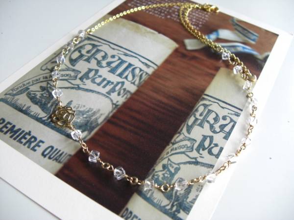 クレアの衣装箱・・シリーズです♪水晶と薔薇と・・繊細な水晶のネックレスです♪♪キューブの水晶に薔薇のチャームを合わせて可憐にロマンチックしています♪水晶は6ミリのキューブ、薔薇は18ミリ位です♪長さは52センチ+アジャスター13センチで最長65センチ位です♪お揃いのブレスレットやイヤリングも出品しています♪シンプルで長く着けられるデザインを考えて作りました♪ハンドメイドをご理解頂いてノークレーム、ノーリターンでお願いします♪