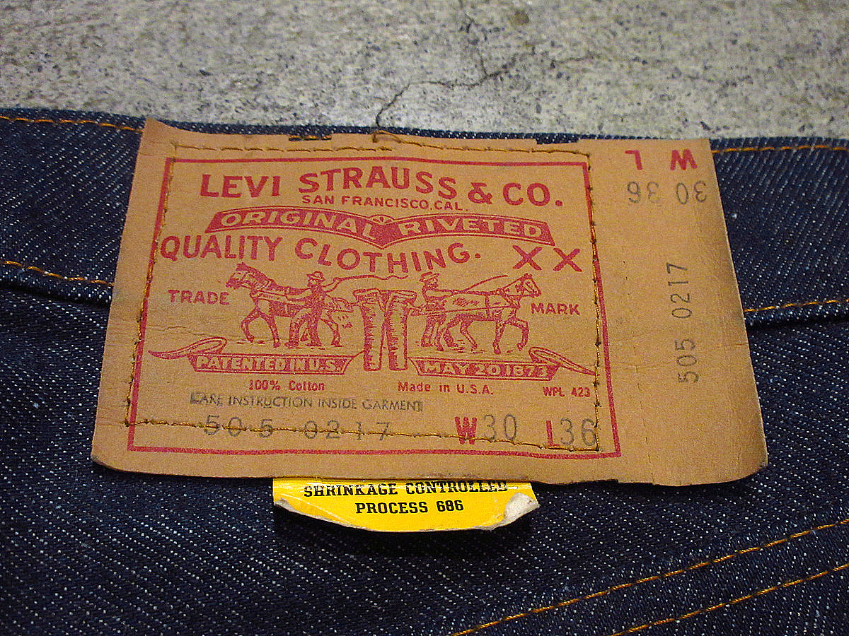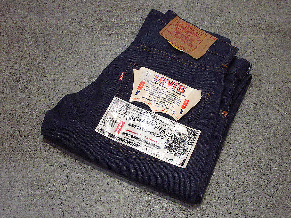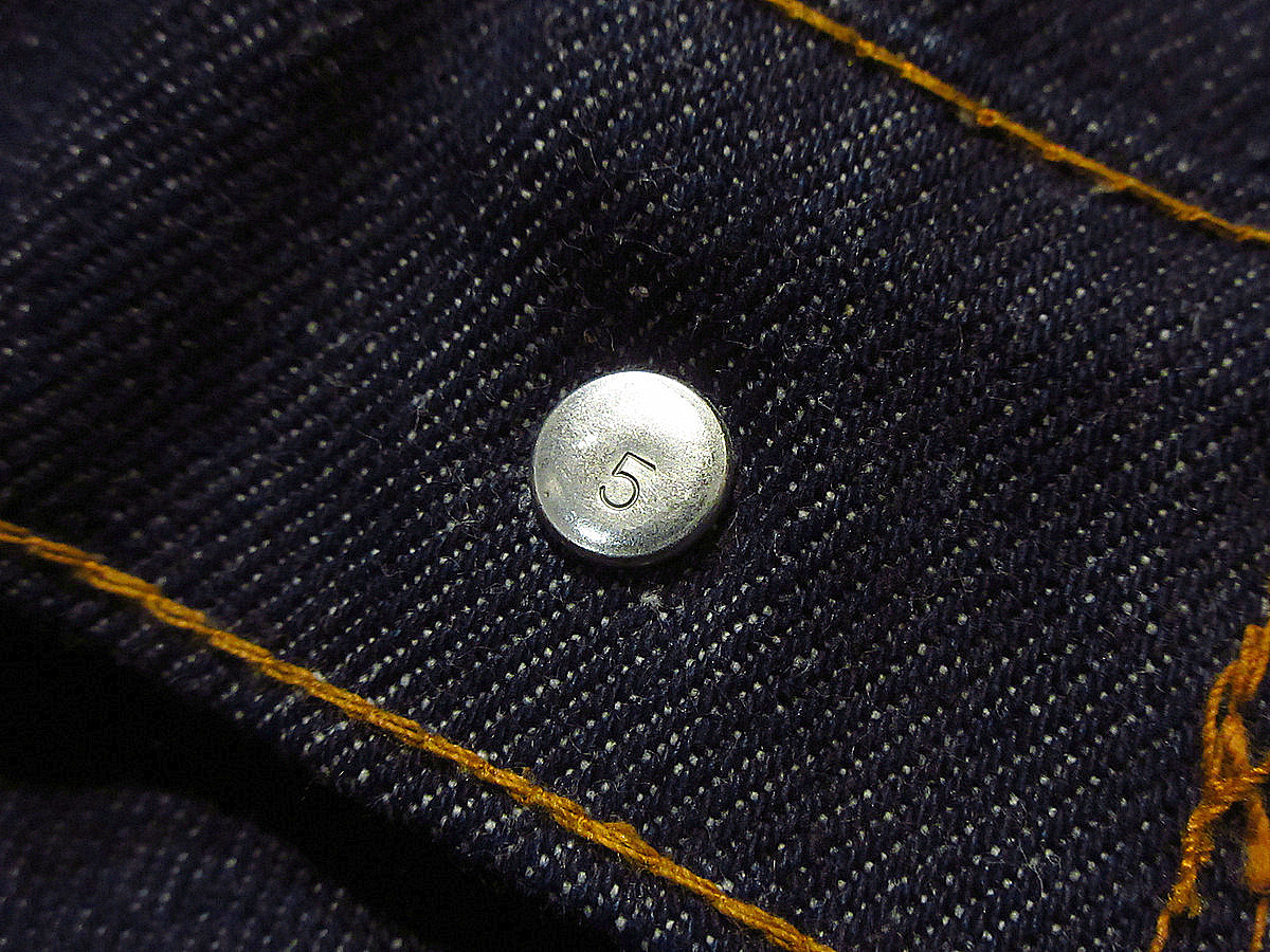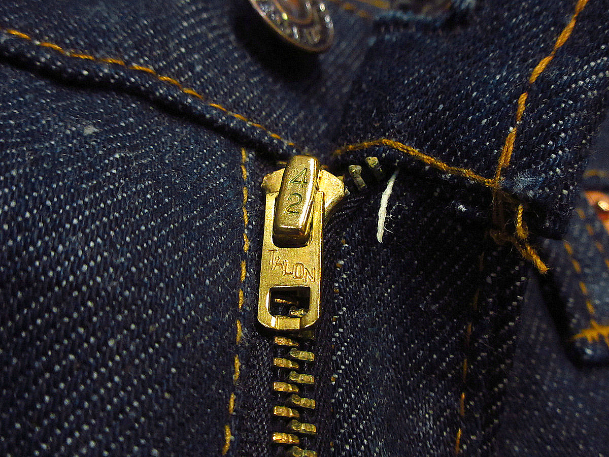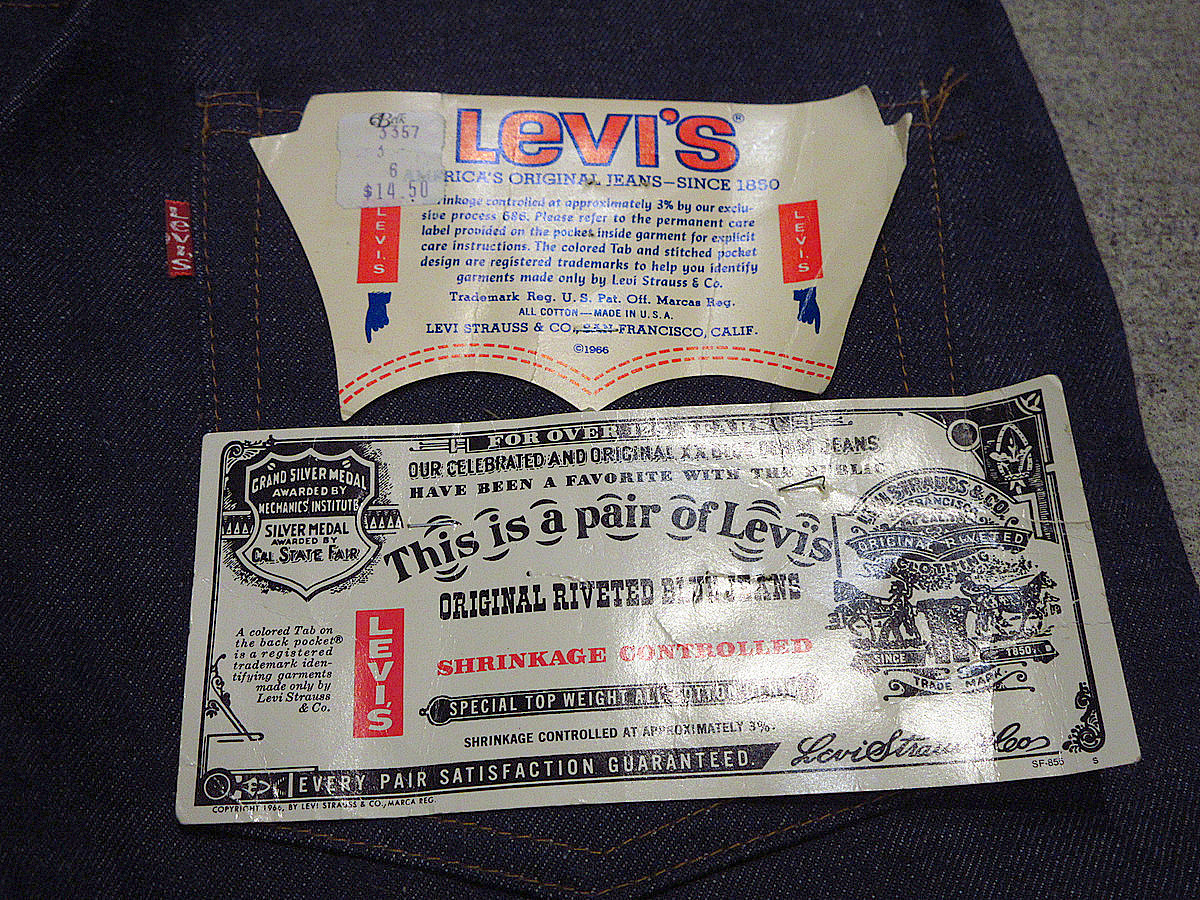 42TALONジッパー、トップボタン裏「5」、アウトシーム脇割り、裾チェーンステッチ、スモールeタブ、ウォッチポケット裏シングルステッチ、MADE IN U.S.A.、フラッシャーに1966年のコピーライト入り、バックポケット裏シングルステッチ
