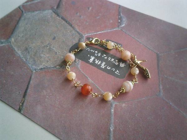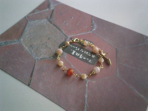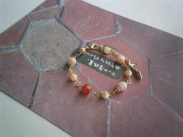 イーニド・ファッション・・シリーズです♪オリエンタル主義・・シックなカーネリアンのブレスレットです♪ふんわりやさしい色合いとストライプ模様のカーネリアンが可憐な表情です♪8ミリのラウンドカットのストライプカーネリアンには6ミリのマザーオブパールを合わせました♪長さは全長23センチ位で調節自由です♪お揃いのネックレスも出品しています♪シンプルで飽きのこないいつまでも着けられるデザインを考えて作りました!ハンドメイドをご理解頂いてノークレーム、ノーリターンでお願いします