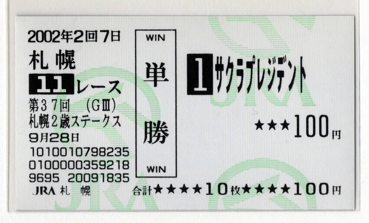 | ★サクラプレジデント 第37回札幌2歳ステークス 現地的中 単勝馬券 旧型馬券 2002年 田中勝春 JRA 競馬 即決 | |