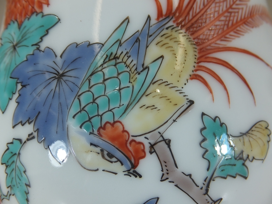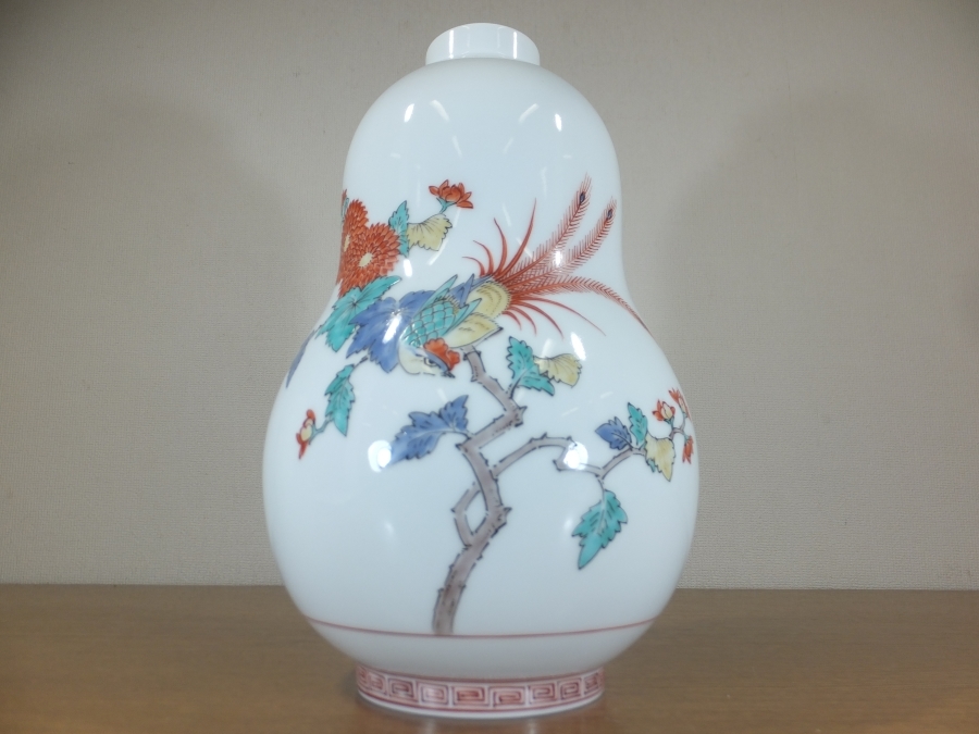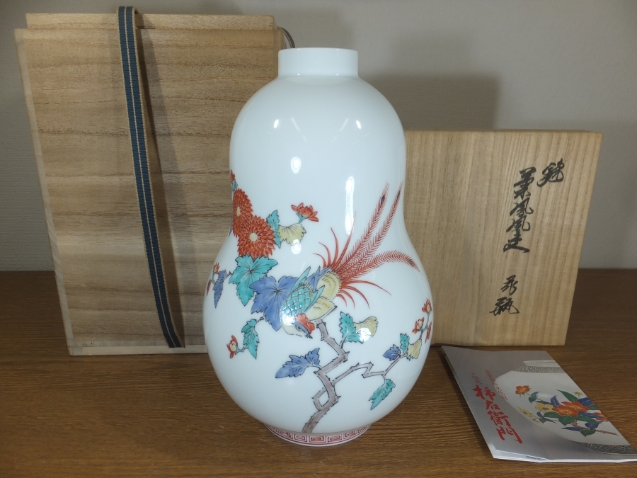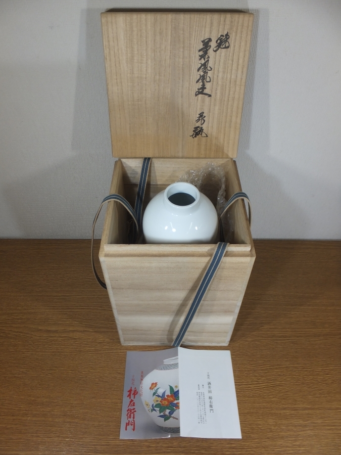 | 説明 | 佐賀県出身 陶芸家で人間国宝 14代 酒井田柿右衛門の、 『錦 菊鳳凰文 花瓶』無傷 共箱 シオリ付です。 状態は良好です。 このままで使用して楽しめますし、飾られても楽しめます。 高台内に「柿右衛門」と銘があります。 大変可愛い瓢箪形の花瓶に、描かれた菊と鳳凰紋様が華やかで上品な作品です。 花を生けずともこのままで楽しめます。 コレクターの放出品です、画像で御確認下さい。 ★九州地方の買出し品です。 買出したままでの出品です、御入札宜しくお願い致します。 入札は早めにお願い致します。 一人でも入札があれば梱包作業に入りますので、素早い発送が可能です。 早期終了あり。 14代 酒井田柿右衛門は、 佐賀県西松浦郡有田町で、13代目の息子として生まれる。 絵付けの基礎となる部分を会得するため多摩美術大学日本画科で日本画を学び、 卒業後帰郷して父親に弟子入りする。 下積みを重ね父と祖父が蘇らせた“濁手”の技法なども学んでいく。 1971年、改名前の本名の酒井田正名義で日本工芸会会員となり、 この後のほぼ10年は本名で公募展や個展に出品した。 1982年、父の死を受け14代目を襲名。 翌年アメリカ合衆国で、 「クローズ・アップ・オブ・ジャパン・イン・サンフラシスコ」にて海外で初出品し、 サンフランシスコ市長から名誉市民号を贈られた。 「14代目柿右衛門展」は国内だけでなく海外で高い評価を集めた。 2001年に重要無形文化財「色絵磁器」の保持者に認定された。 また広く後進の育成にも力を入れ、大学で教えるほか、 2011年にはJリーグの地元クラブ・サガン鳥栖のデザインアドバイザーにも就任した。 2008年前後に癌が見つかってからは治療しながら活動を続けていたが、 2013年5月、体調が急に悪くなり佐賀大学医学部付属病院に入院。 それからひと月ほどで死去。 死因は直腸癌と転移性肝腫瘍であった。 なお、JR九州のクルーズトレイン「ななつ星in九州」の、 洗面所に使用されている洗面鉢が遺作となった。 |