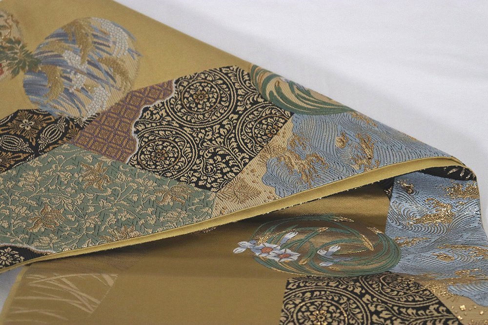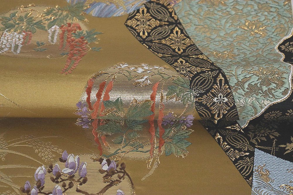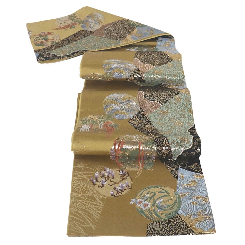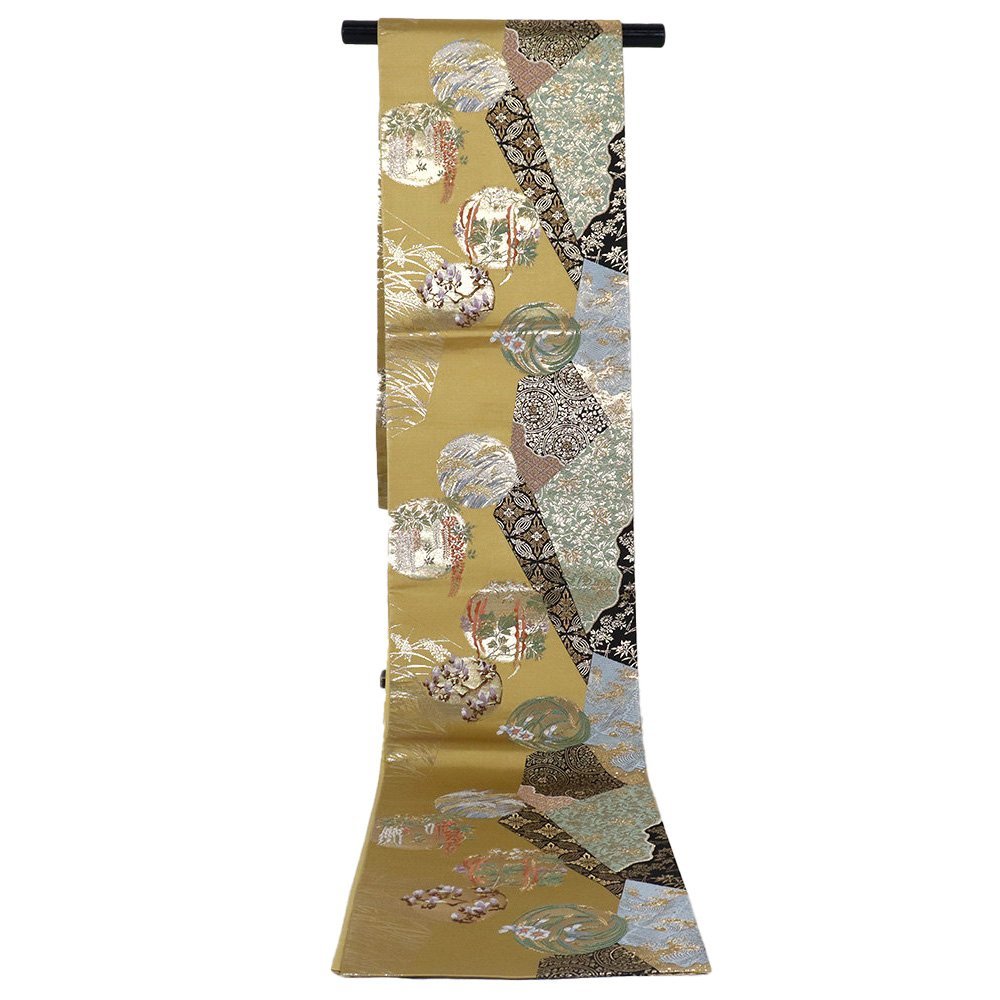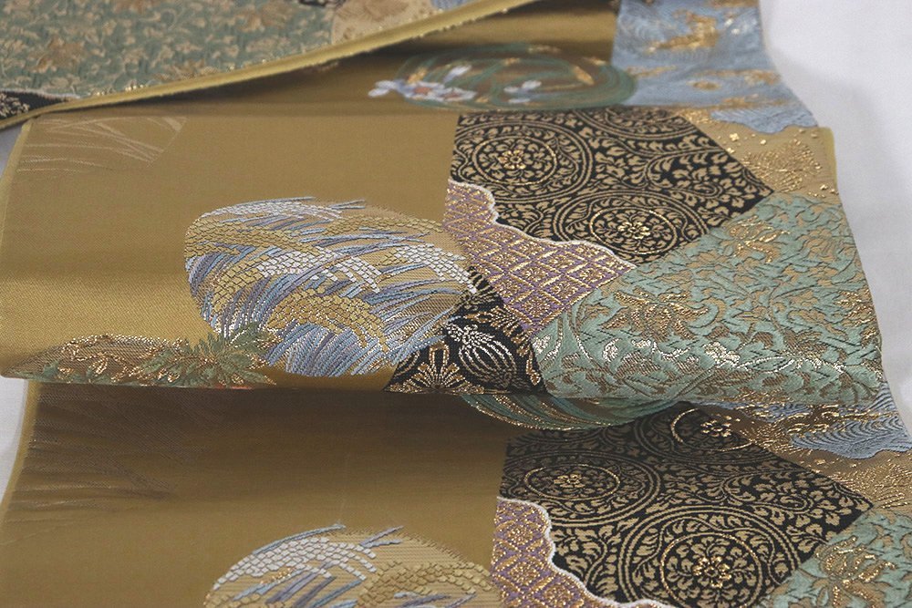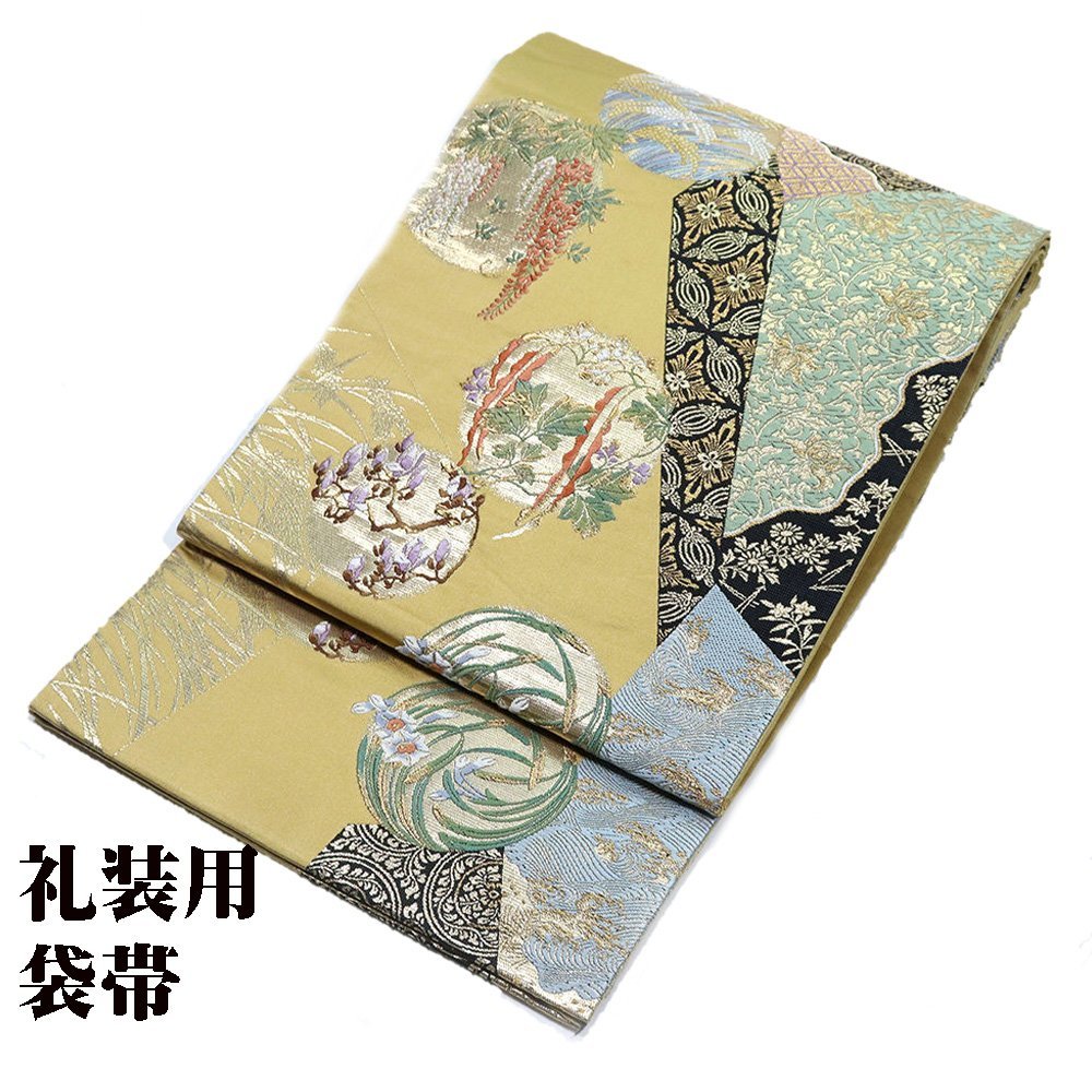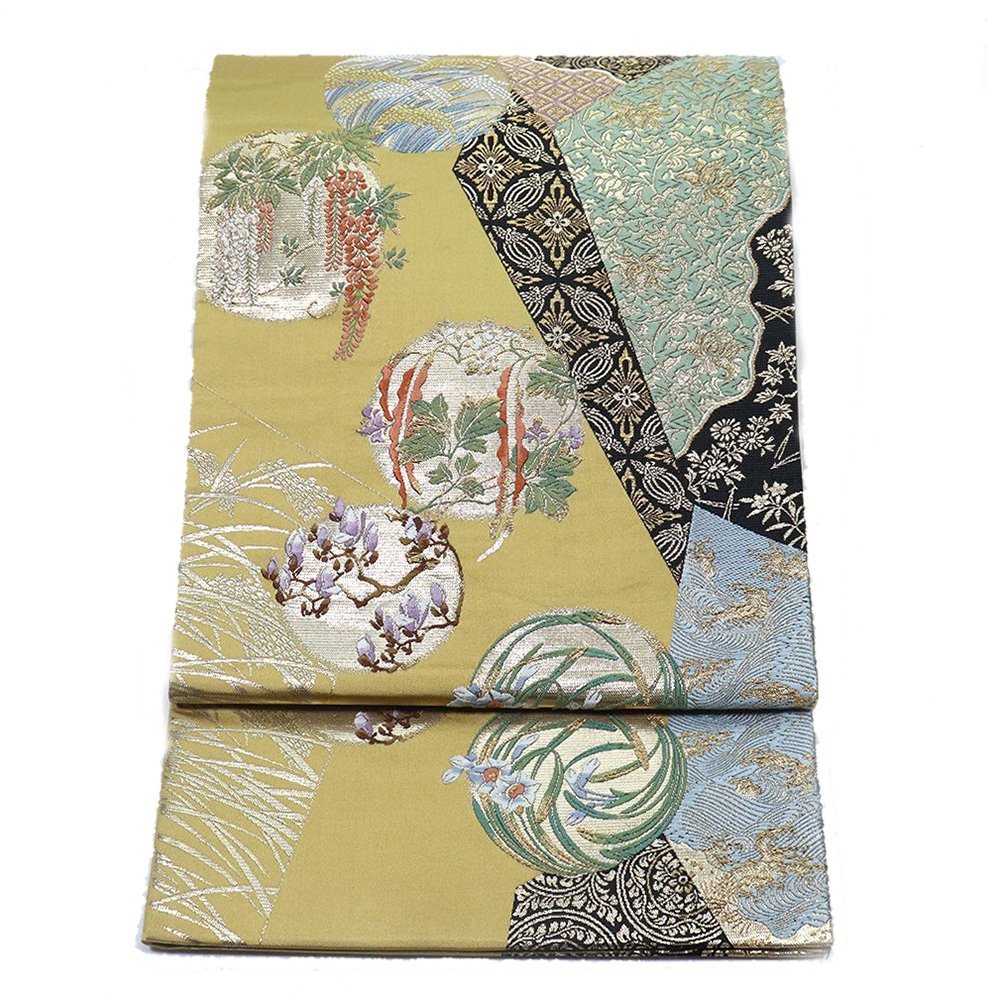 | 西陣織袋帯 都錦 金茶・黒・金箔・緑地 花丸文 稲穂・藤・木蓮・水仙・華文・花菱・七宝文 仕立て上がり | |