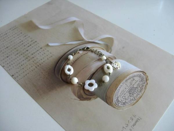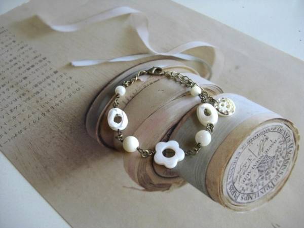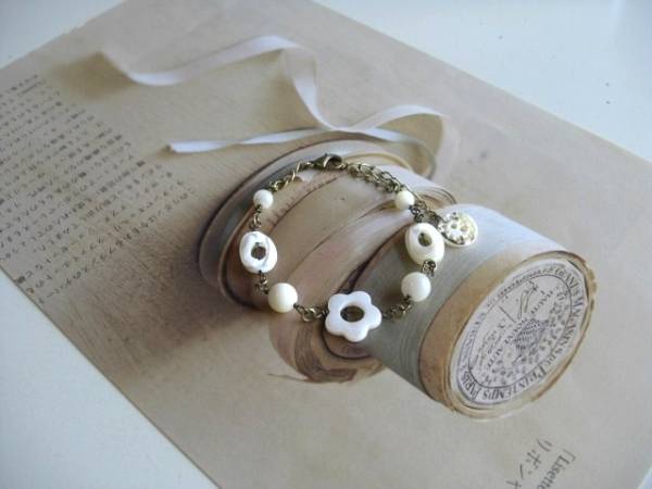 初夏のクローゼット・・シリーズです♪白のリネン・・やさしいオフホワイトのシェルのブレスレットです♪丸玉やオーバルやフラワーのリングなどデザイン違いのシェルがロマンチックな表情です♪6ミリ、8ミリの丸玉や14ミリのオーバルリングや15ミリのフラワーリングのブレスレットは全長23センチ位で調節自由です♪お揃いのネックレスも出品しています♪シンプルで長く着けていただけるデザインを考えて作りました!ハンドメイドをご理解頂いてノークレーム、ノーリターンでお願いしま