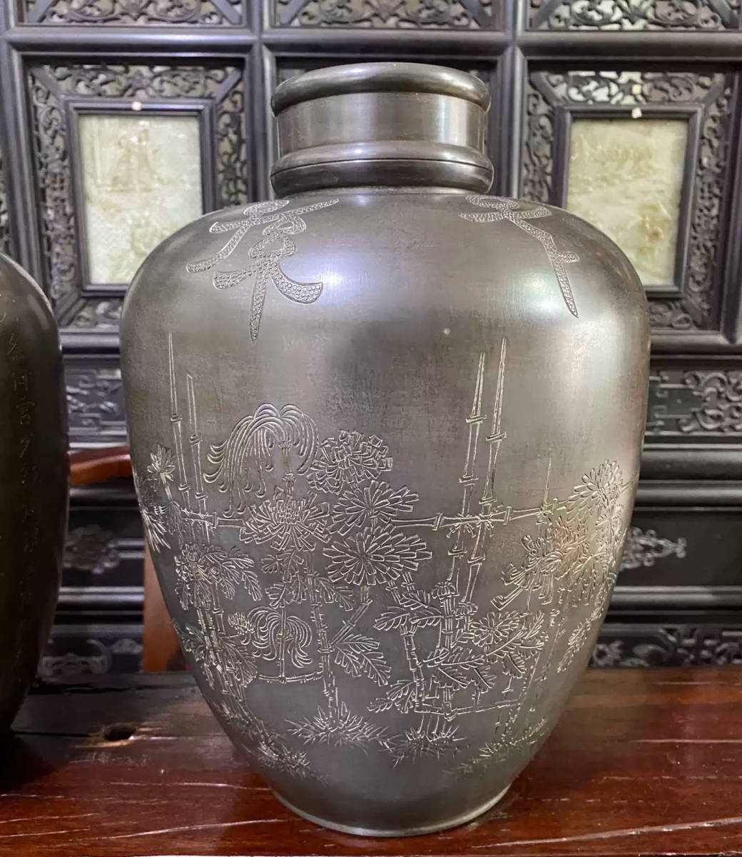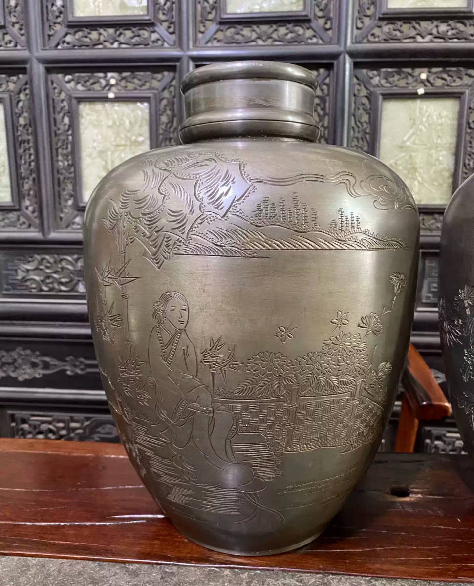 品名:錫刻仕女花卉詩文図大茶心壺一対