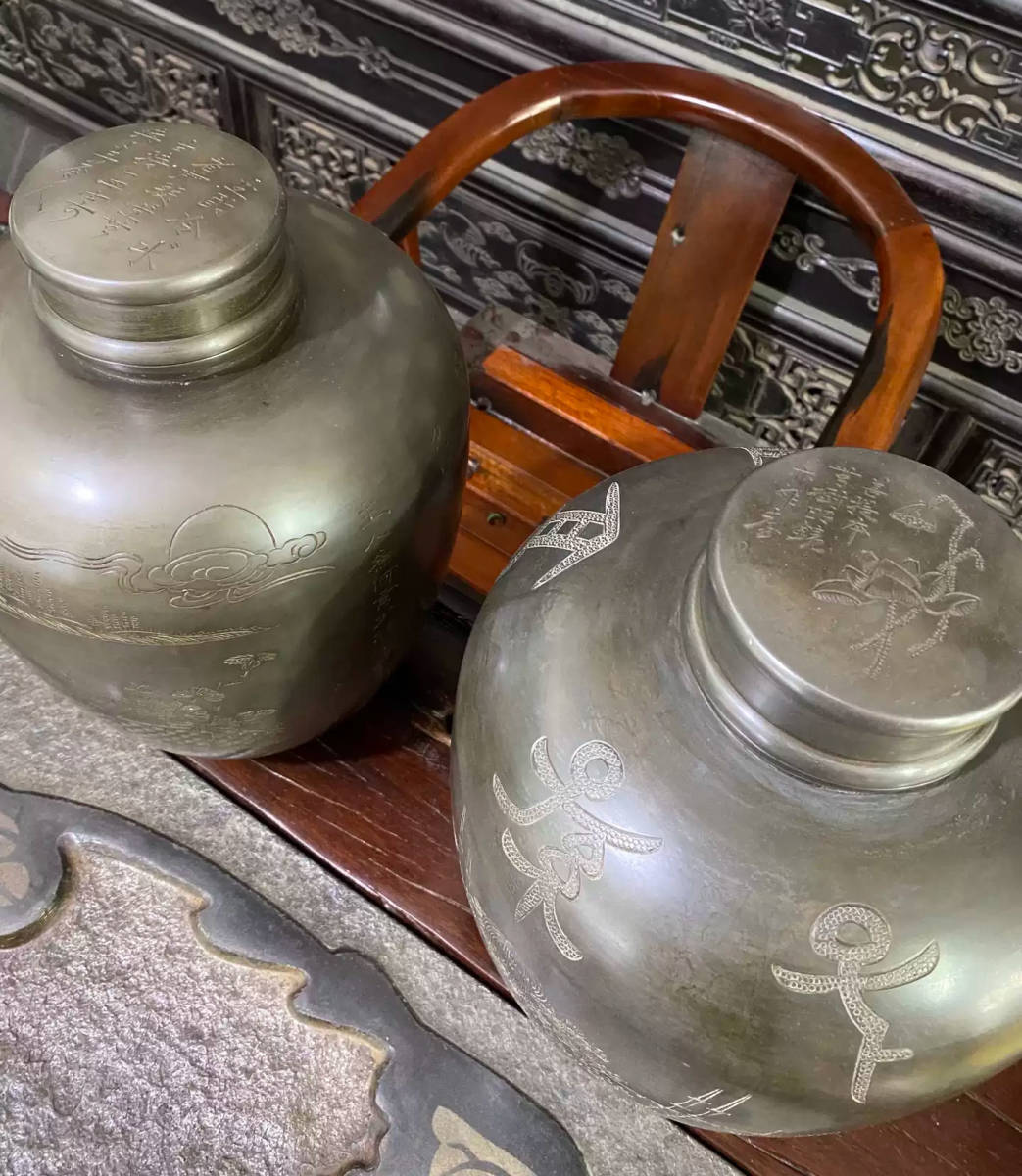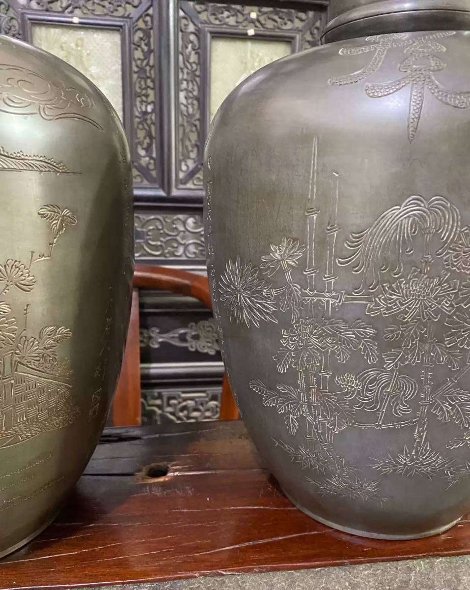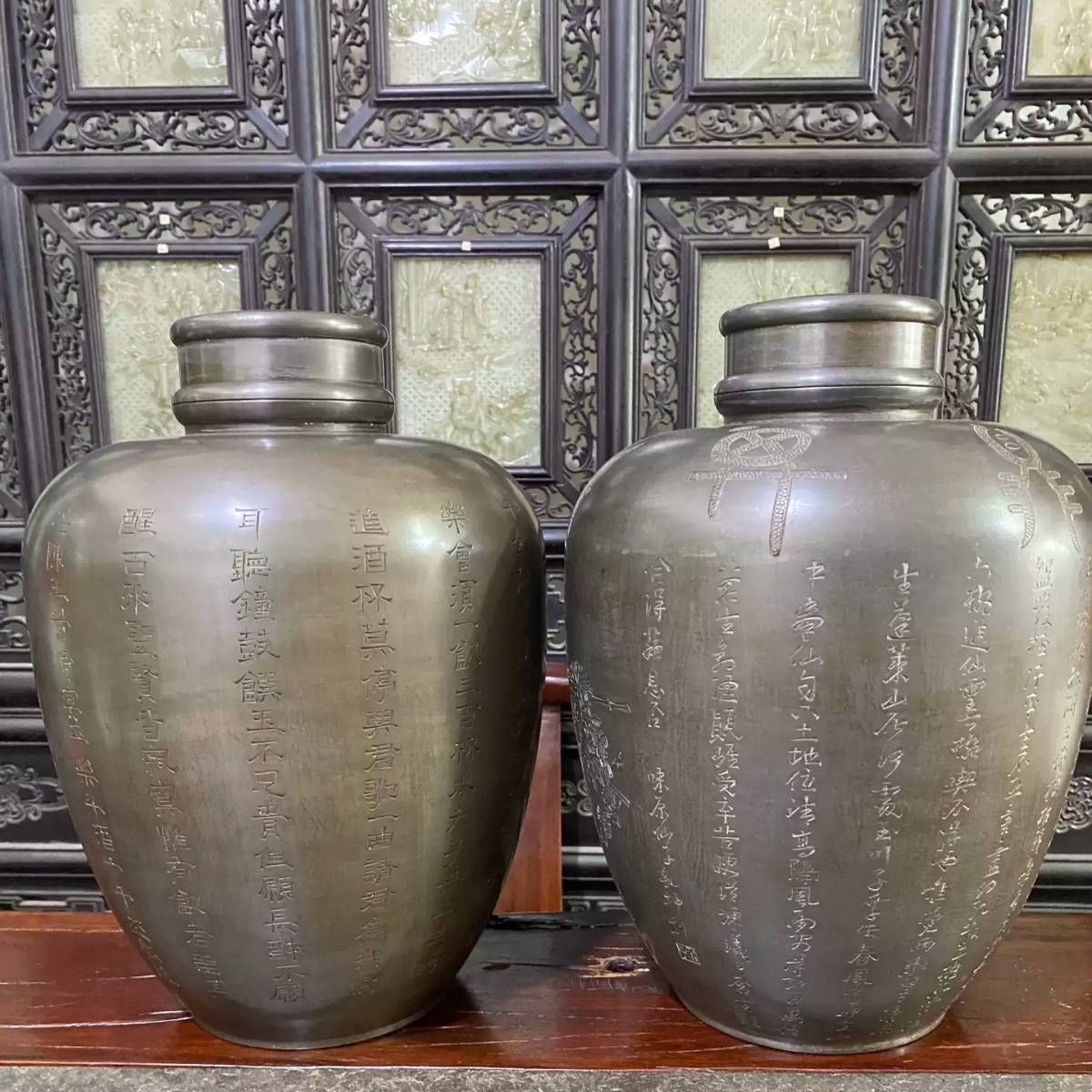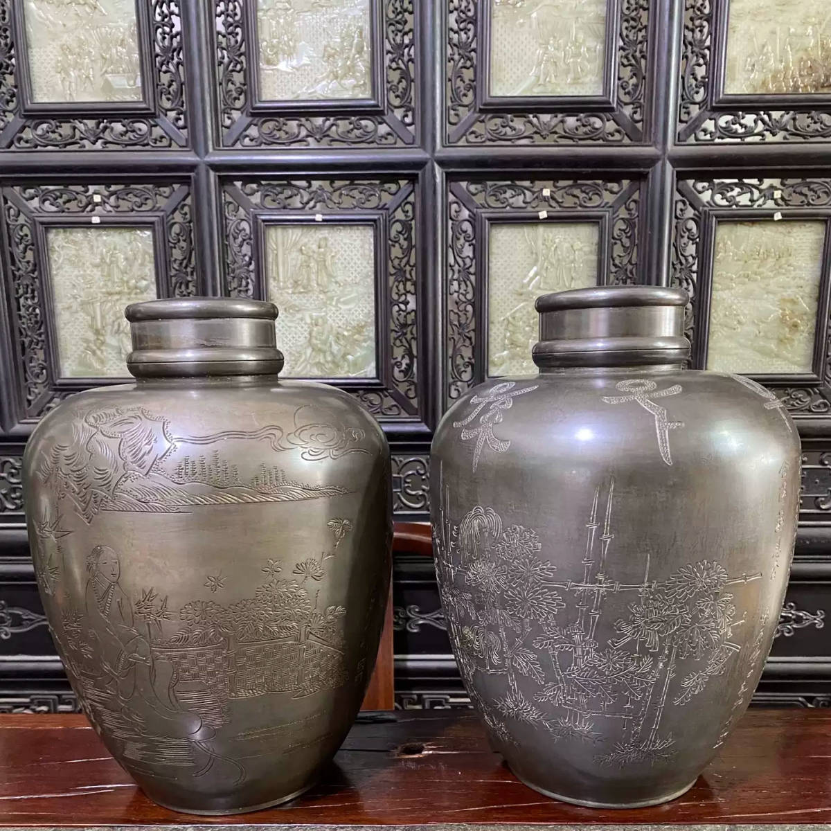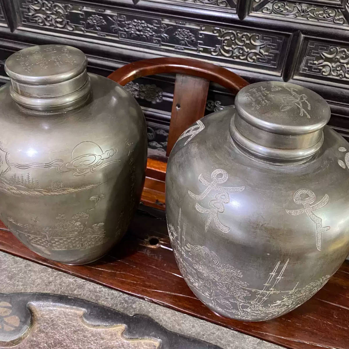古錫 茶葉罐 藏六居造 「錫刻仕女花卉詩文図大茶心壺一対」 茶筒 茶入 茶壷 茶道具 純錫 時代物 | |||