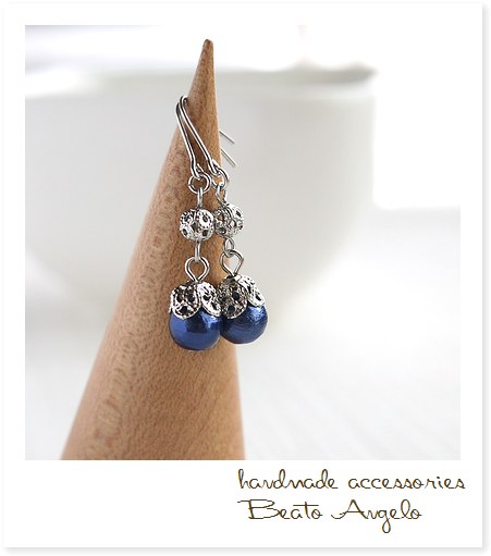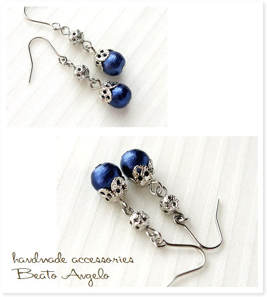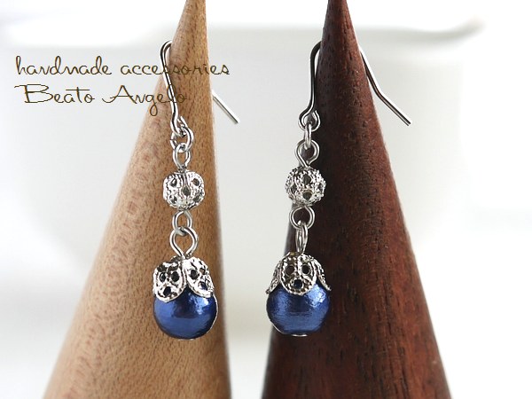 コットンパールと透かし玉のピアス(p-220)ダークブルー S