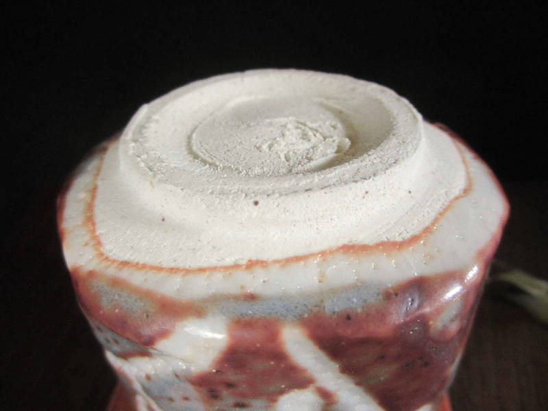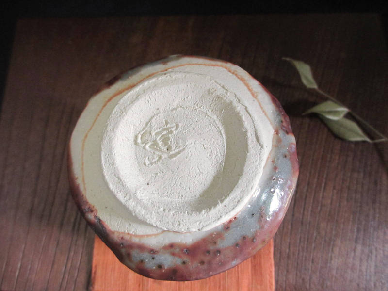 厚く掛けた長石釉に化粧掛けした鉄釉が、窯変により鼠色と茶褐色の斑模様になり、白い梅は古風な風情を感じられます。凹凸のある表面には全体に貫入がみられます。
