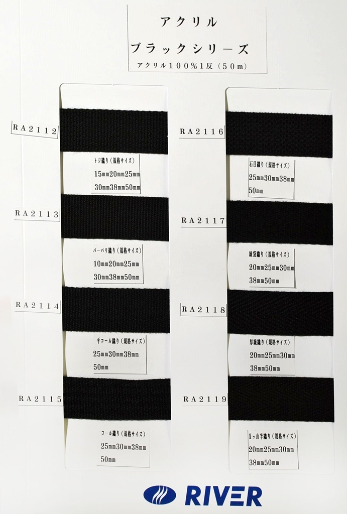 アクリル100%テープです。様々な織り方を揃えております。