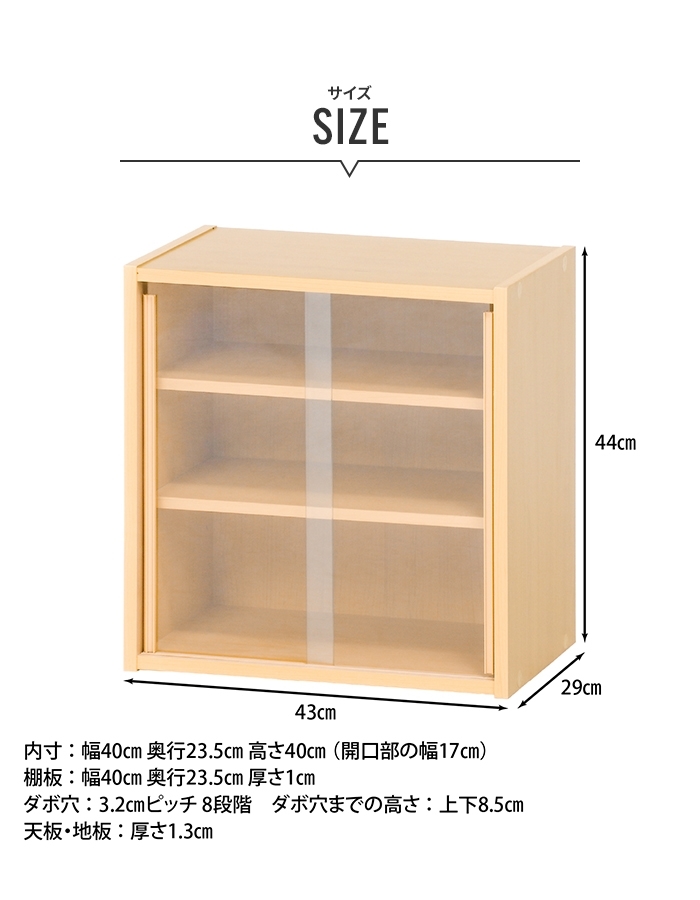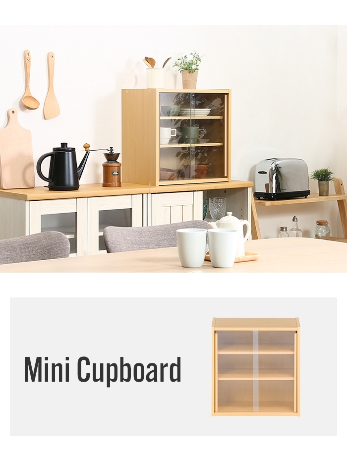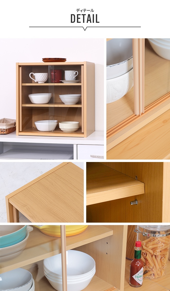 | 前面がガラス扉で、中に何があるか一目で分かる! 収納するものの高さに応じて棚板を調整できる可動棚! |