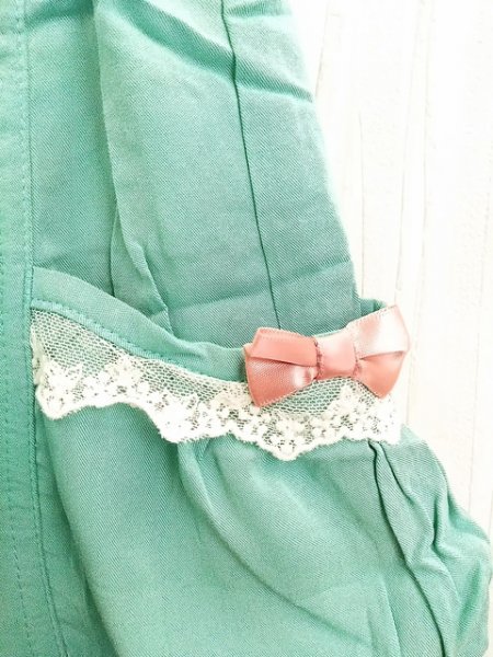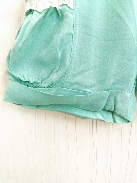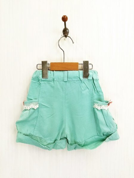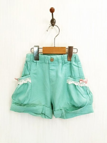 KU0152 ○送料無料 古着 nino ニノ キッズ キュロット パンツ サイズ100cm 青 ターコイズ ブルー 女の子 リボン レース 薄手 夏 カジュアル