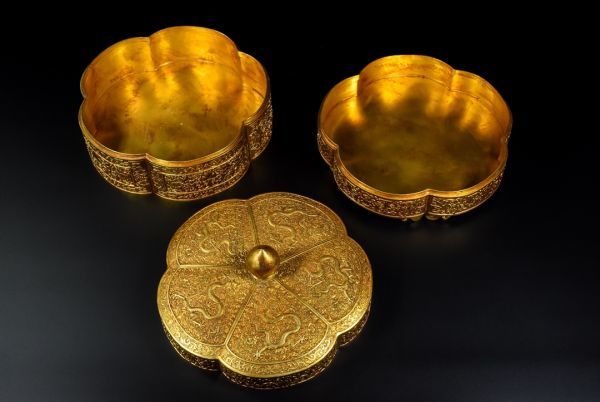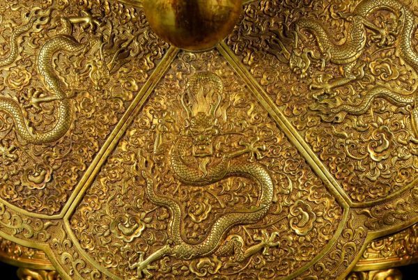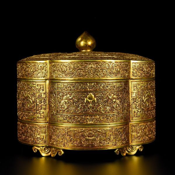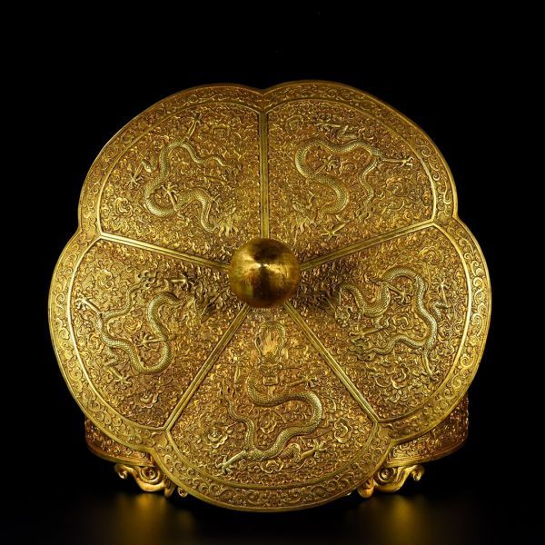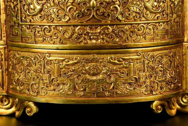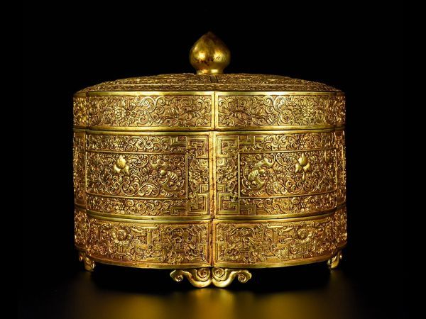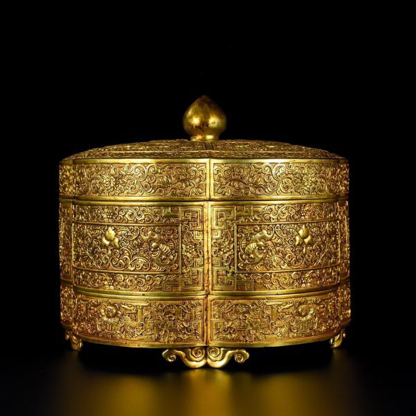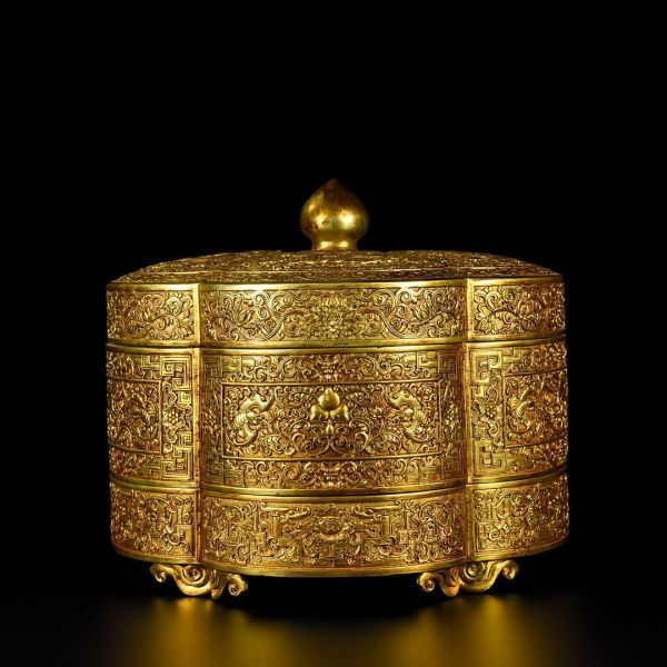 清代 乾隆年製 古銅鏨刻彫 塗金五龍双層食盒【仁】古青銅器 置物擺件 古賞物 中国古美術 蔵出