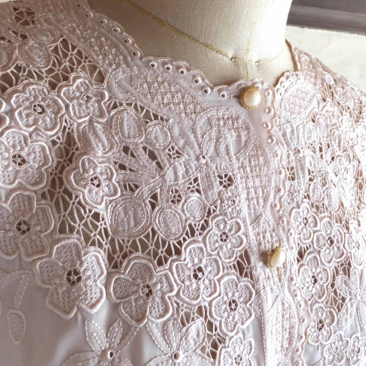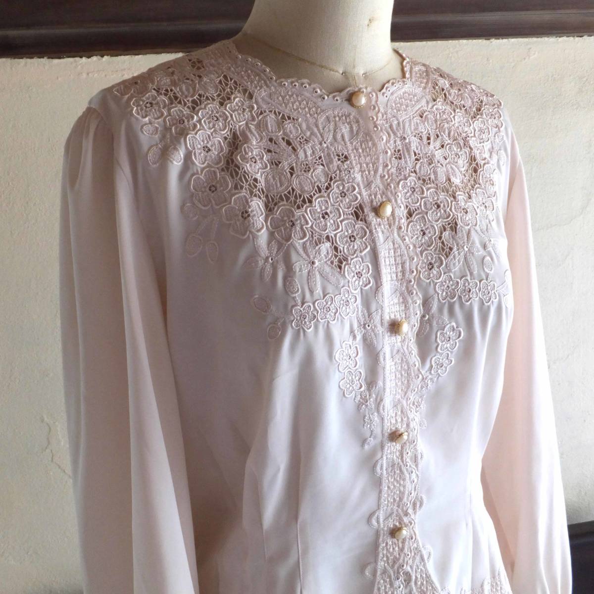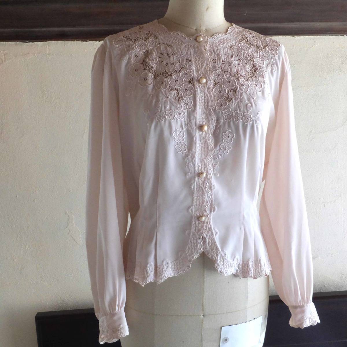 SANMARINO 汕頭風 シルク刺繍 長袖 ブラウス サイズ9 薄ピンク ポリエステル100%生地 レディース 透かし模様 ヴィンテージ