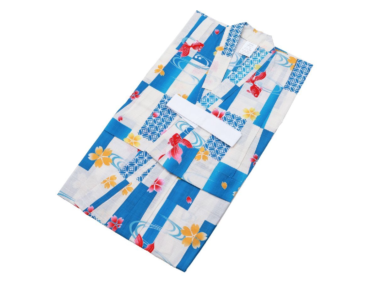 ◆120cmサイズ 子供 ゆかた◆綿素材 仕立て上がり 浴衣 単品 キッズ kn-35 15金魚市松アイボリー系