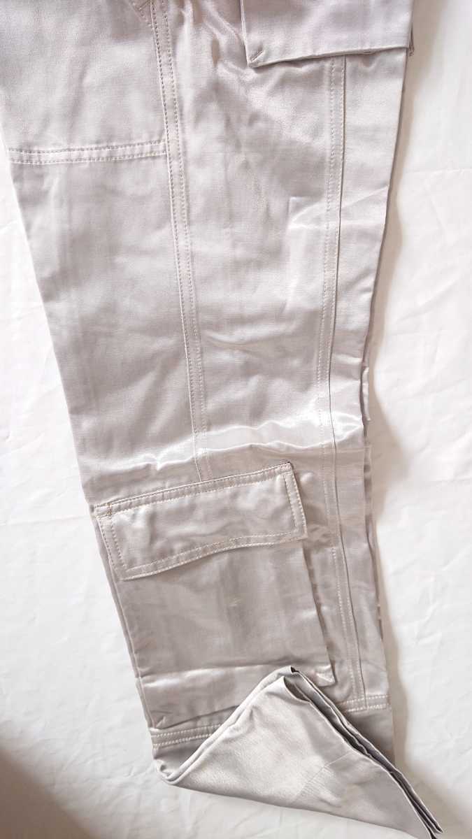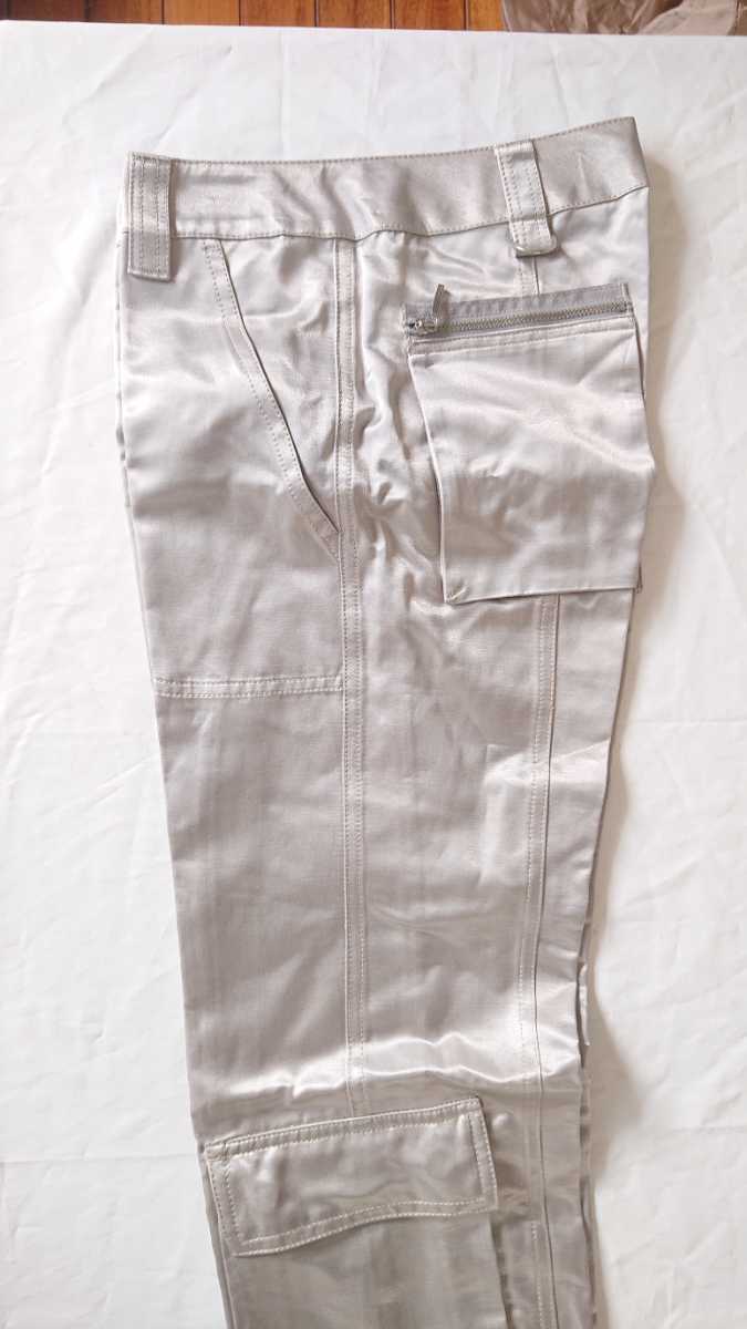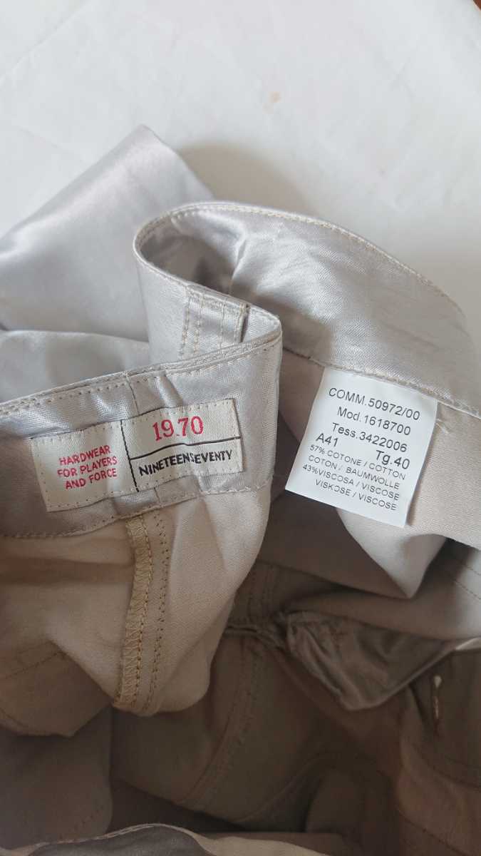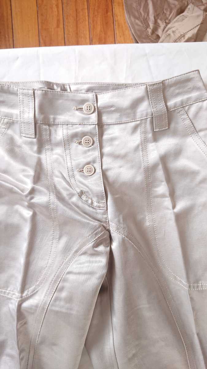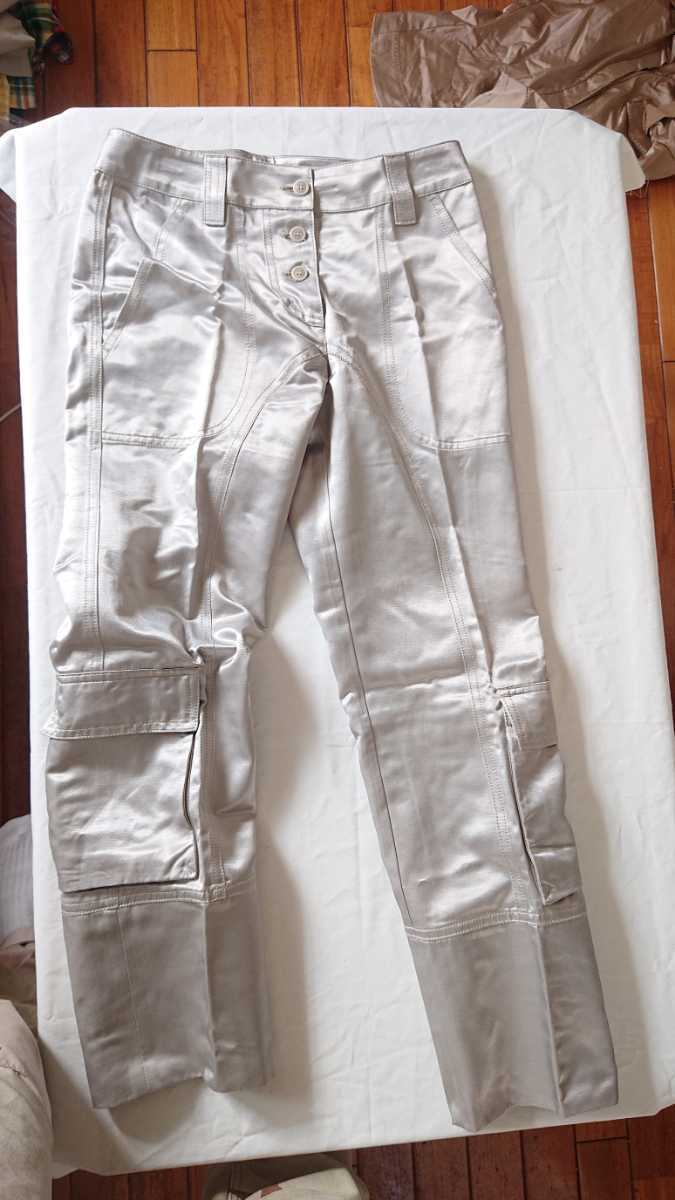 イタリアの人気ブランドSEVENTYの19_70の綿&ポリエステル混合素材のパンツです。色はテカリのある銀色です。イタリアの人気ブランドだけあって、デザインはとてもエレガントです。サイズは40表記で、日本だとレディースのSになります。