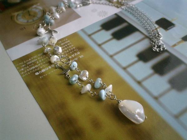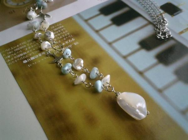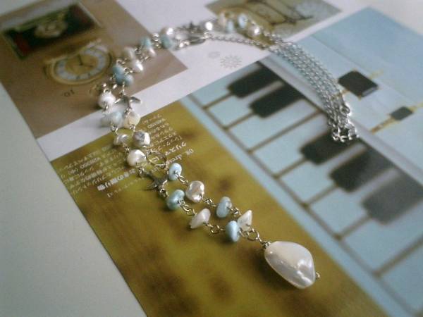 シモーヌの宝石箱・・シリーズです♪春色を集めて・・シックな水色のラリマー、オフホワイトのマザーオブパール、芥子パールやハウライトなど春色を集めたネックレスです♪大きさは6ミリから9ミリ位までのさざれやラフカットです♪小さな小鳥さんのチャームを合わせて可憐な表情です♪長さは全長86センチ位で調節自由です♪トップのマザーオブパールは18×14ミリ位です♪同じデザインの長さ違いのネックレスやブレスレットも出品しています♪シンプルで飽きのこないいつまでも着けられるデザインを考えて作りました!ハンドメイドをご理解頂いてノークレーム、ノーリターンでお願いします