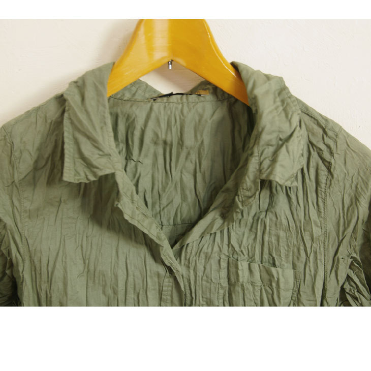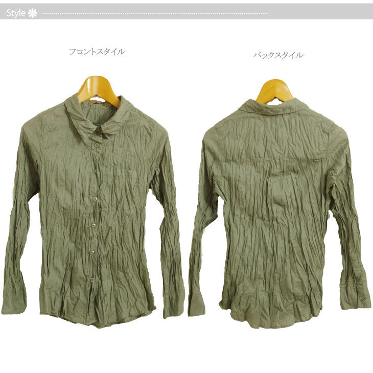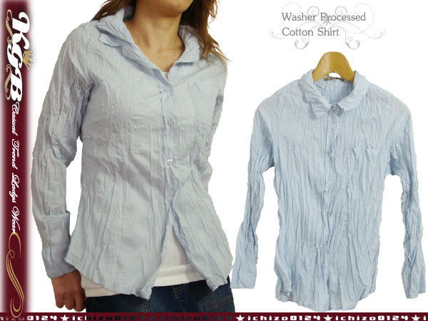 4L サックス シャツ 長袖 レディース 綿 ワッシャー加工 シワ加工 無地 コットン 新品