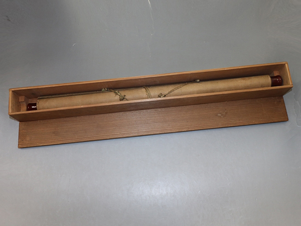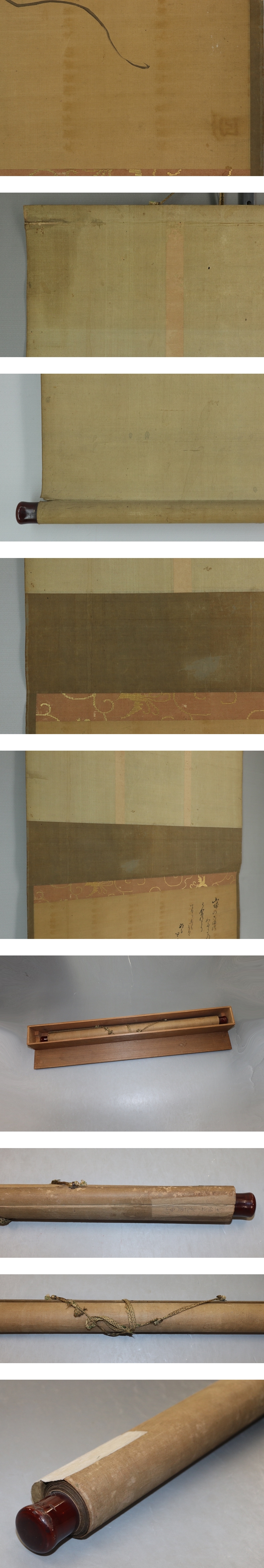 土佐光貞 とさ-みつさだ(1738-1806) 江戸時代中期-後期の画家。 元文3年7月9日生まれ。土佐光芳の次男。土佐光淳の弟。 宝暦4年分家して,宗家の兄と共に絵所預となる。 寛政2年の内裏造営の際,宗家の土佐光時を助け,障壁画の制作にあたった。号は廷蘭。 文化3年2月4日死去。69歳。 本紙は、染み、汚れ、折れ、皺、強いヤケがあります。 表装は、染み、汚れ、折れ、皺、くすみ、虫食い、破れ、ほつれ、修理痕、 軸先に汚れと傷、軸紐に劣化があります。 【サイズ】 作品 横約54cm×縦約38.5cm 表装 横約56.5cm×縦約122cm |