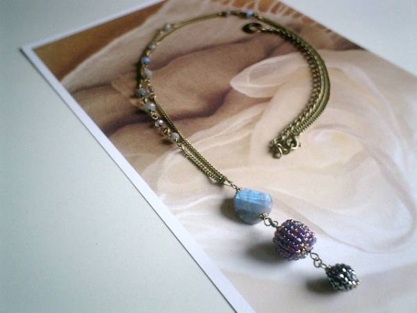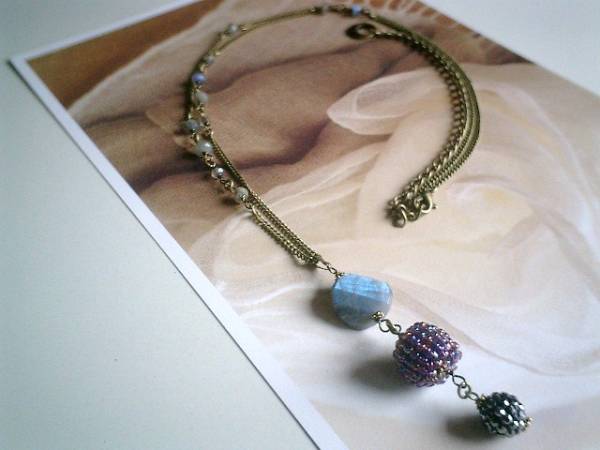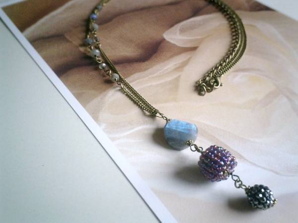 物語をアートして・・シリーズです♪青い宝石のコレクション・・神秘的なラブラドライトのネックレスです♪シラーが輝くラブラドライトはロンデルカットやコインカットです♪同じブルー系のビーズ玉を合わせてニューヨーク・モダンしています♪本体には4ミリから6ミリ位までのロンデルカットのラブラドライトをトップには16ミリのコインカットのラブラドライトやビーズ玉を合わせました♪長さは72センチ+アジャスター14センチで最長86センチ位です♪トップは7.5センチ位です♪お揃いのブレスレットも出品しています。ハンドメイドをご理解頂いてノークレーム、ノーリターンでお願いします