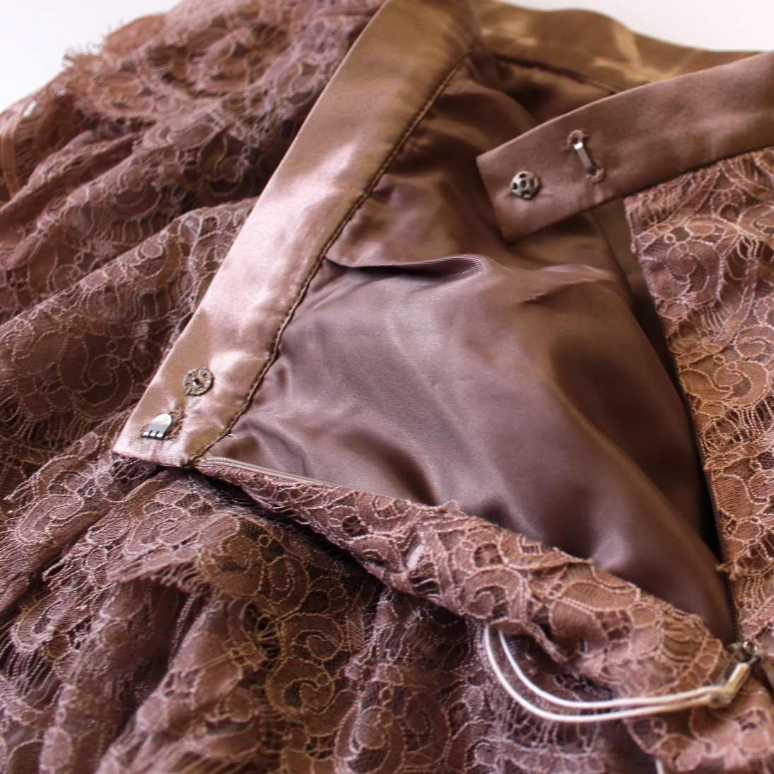 高級感のある光沢サテン地に動きのあるギャザーレースの4段ティアードフリルがきれいなスカート。