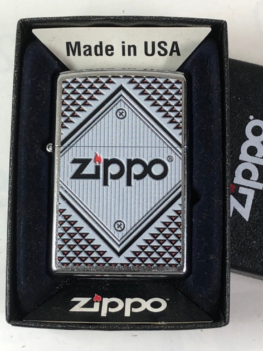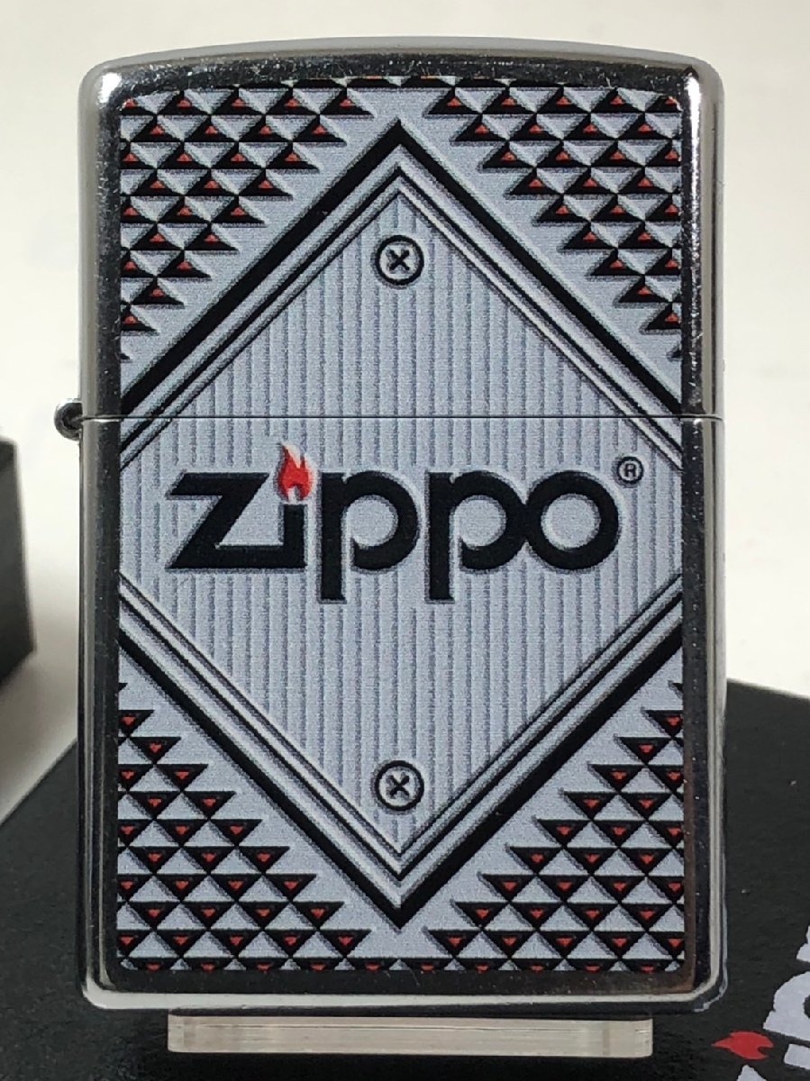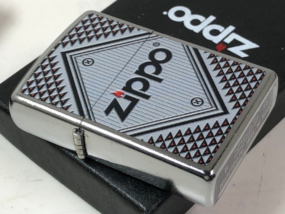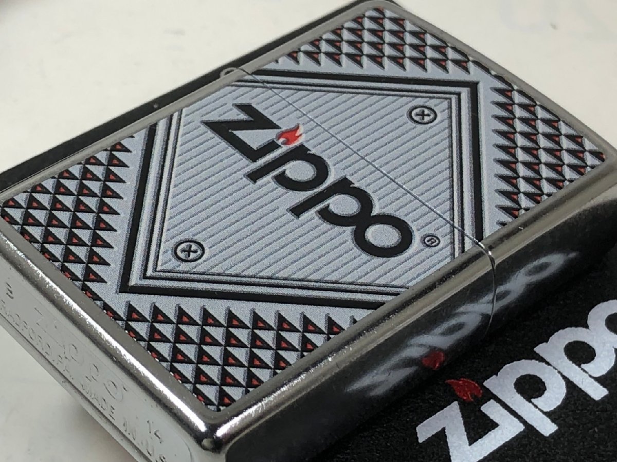 ■Zippo RED&CHROME#28465(純正)、ジッポー社Chromeベースの絶版デザイン。平面プリント加工ですが、立体デザインに見えます。Zippo社純正品。強度・仕上げの良さで安心感があります。裏面は無地。ジッポ207(ストリートクローム)ベース。