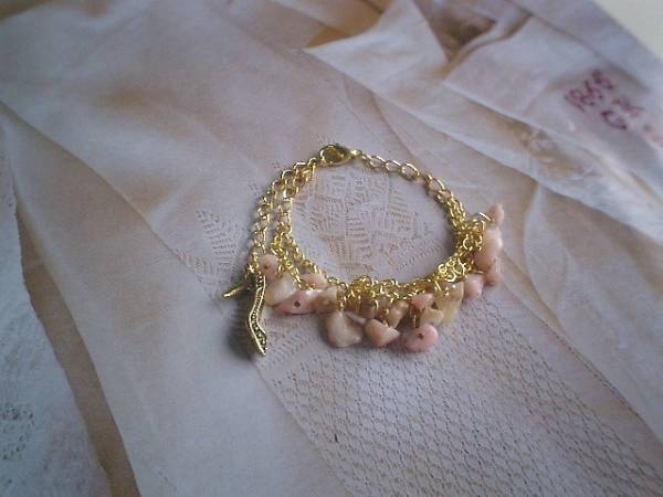 ネオ・ロマンチック・・シリーズです♪モンローに憧れて・・シックなピンクオパールのさざれのブレスレットです♪6ミリから9ミリ位までのやさしい風合いのさざれを2連のチェーンに繋いでロマンチックな表情です♪長さは全長22センチ位で調節自由です♪お揃いのネックレスやピアスも出品しています♪シンプルで飽きのこないいつまでも着けられるデザインを考えて作りました♪ハンドメイドをご理解頂いてノークレーム、ノーリターンでお願いします
