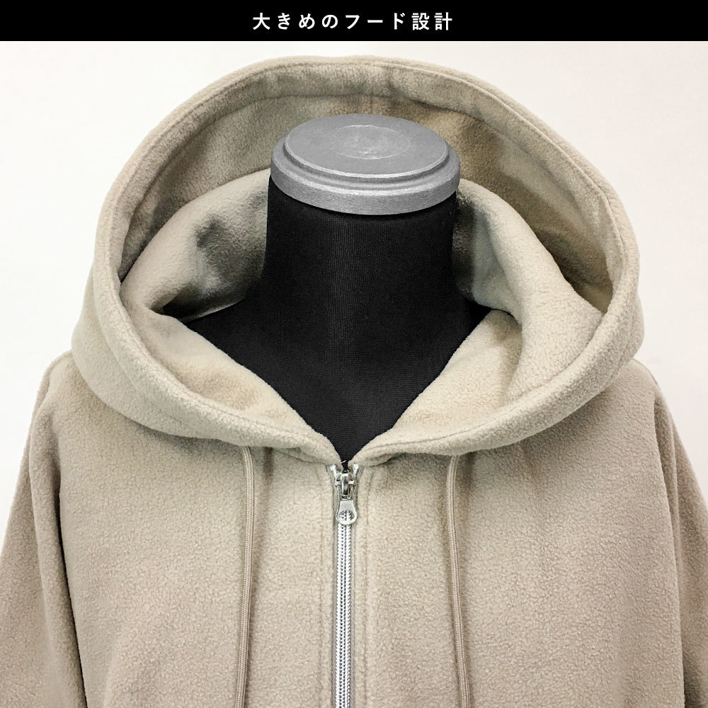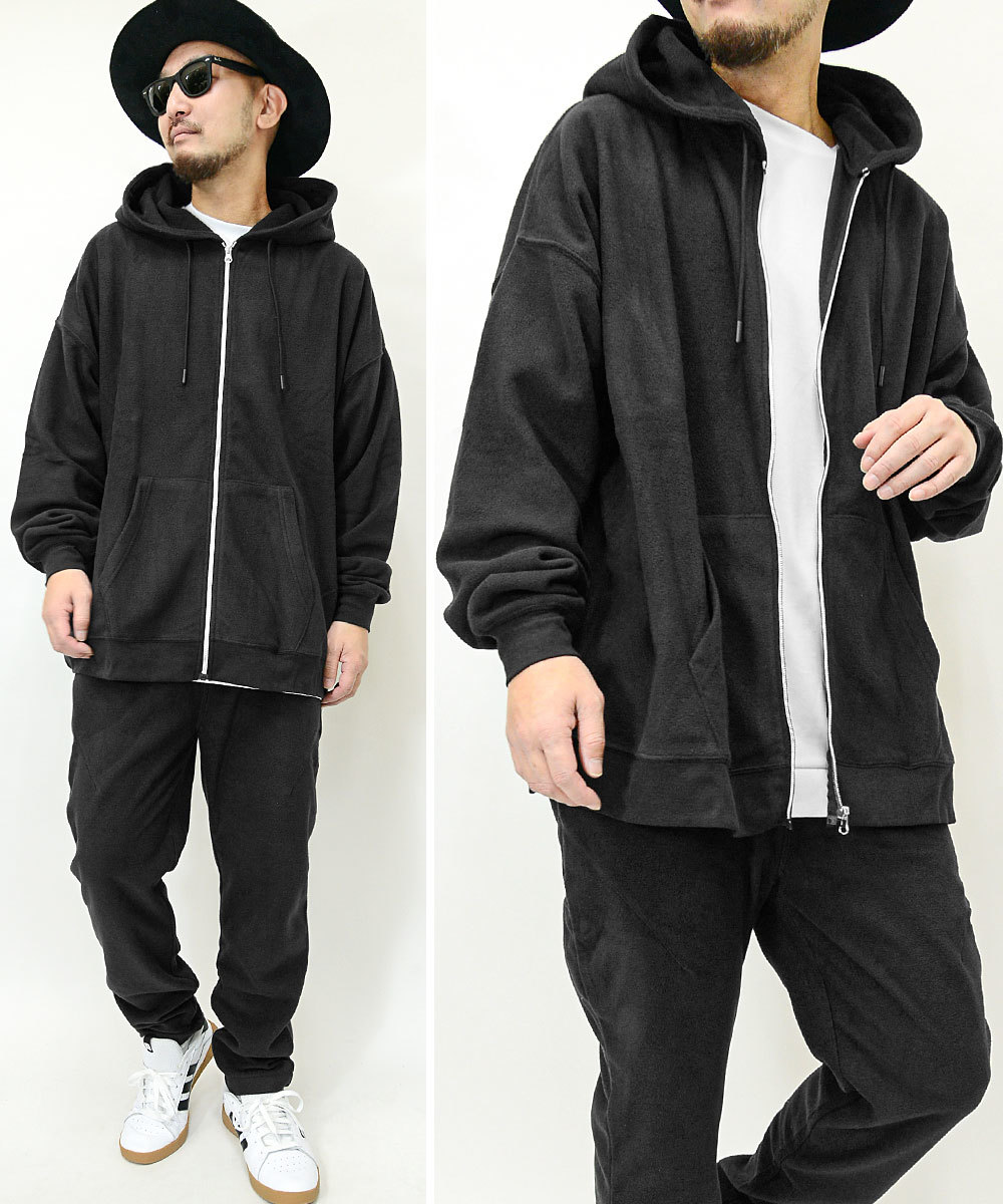 ドロップショルダーのビッグシルエットで演出するジップアップパーカー。