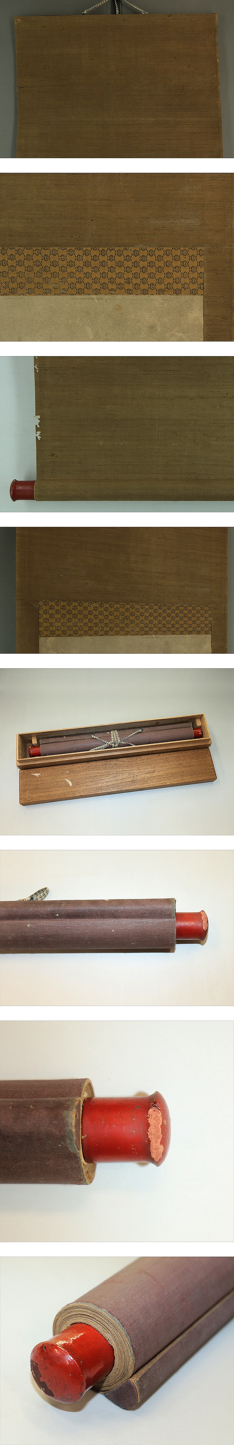 狩野養川院 江戸後期の画家。 木挽町狩野家七世。栄川院典信の長男。 名は惟信、幼名は栄次郎、別号に玄止斎。 画を父に学び、父の歿後その跡をついで幕府の奥絵師となり法印に叙せられる。 文化5年(1808)歿、55才。 本紙は、染み、汚れ、強めの折れ、皺、虫食、擦れ、ヤケがあります。 表装は、染み、汚れ、折れ、皺、虫食、破れ、ほつれ、くすみ、剥れ、軸先に汚れと傷みがあります。 【サイズ】 作品 横約28.5cm×縦約101cm 表装 横約35cm×縦約168cm |