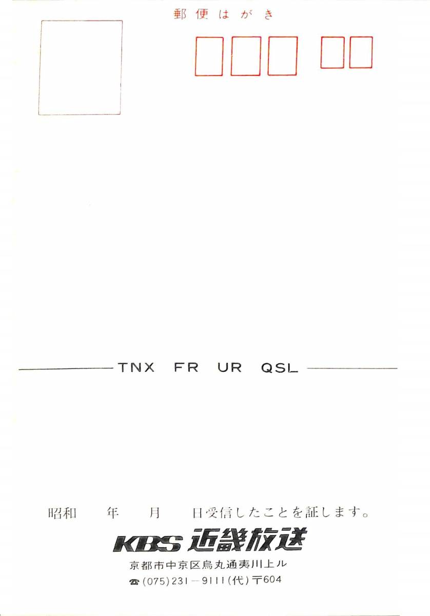 | 【商品名】・・・JOBR(★KBS・近畿放送)のベリカード。 【コメント】・・・昭和30年代~40年代のベリカードは大変貴重です! ■当方、1枚のみ所有していますので即決で落札者様のコレクションになります! 【国名・地名】・・・日本★京都府。 【受信データ】・・・1970年代(★昭和40年代後半)・MW1140KHZを受信。 【記載事項】・・・未記入。 【状態】・・・シワ、汚れ、シミ、焼け、色あせ等があります。 ■カードの状態は★画像を参考に判断して下さい。 ■この機会にぜひこのベリカードを貴方のBCLコレクションに加えて下さい! | |