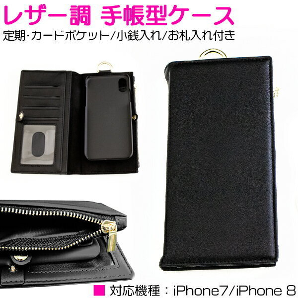 iPhone7/8用 iPhone7ケース iPhone8ケース 財布付き 手帳型ケース カード入れ カードケース 4ポケット レザー調 ブラック/黒