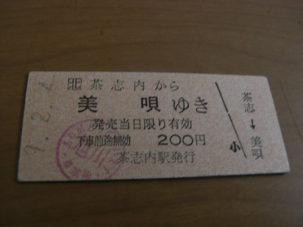 函館本線 茶志内から美唄ゆき 200円 平成9年2月4日 茶志内駅発行